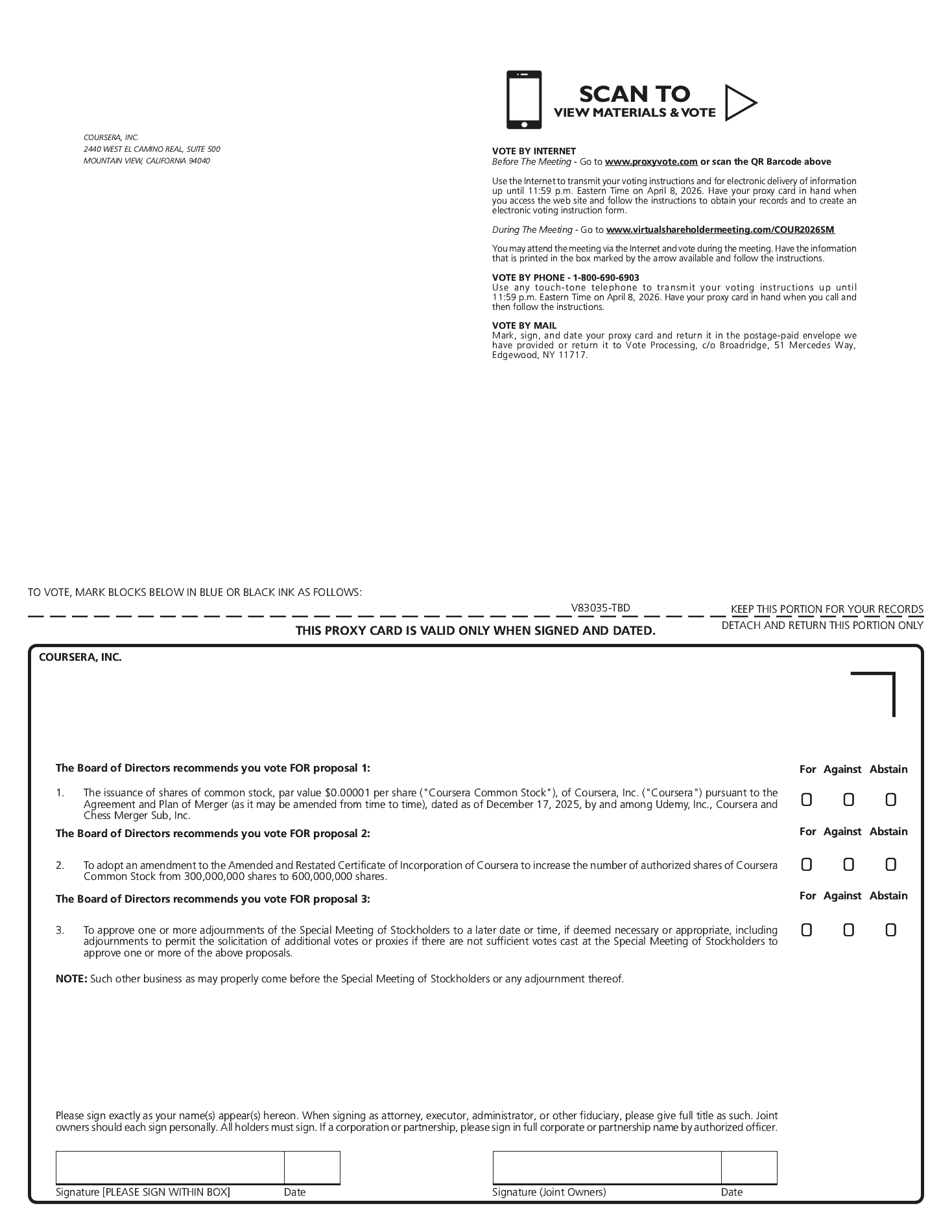 • | to vote on a proposal to approve the issuance of shares of common stock, par value $0.00001 per share, of Coursera (“Coursera Common Stock”), pursuant to the terms of the Agreement and Plan of Merger, dated as of December 17, 2025 (as it may be amended from time to time, the “Merger Agreement”), by and among Coursera, Chess Merger Sub, Inc., a direct wholly owned subsidiary of Coursera (“Merger Sub”), and Udemy, Inc. (“Udemy”) (the “Coursera Share Issuance Proposal”); |