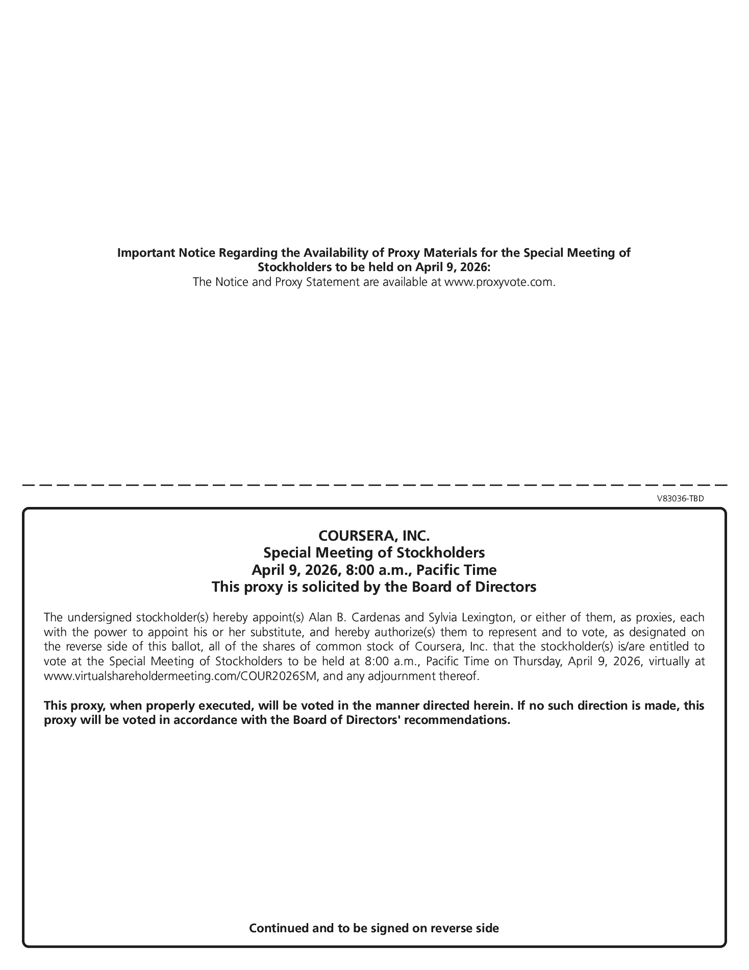 A: | Coursera. The Coursera Special Meeting will be held virtually via live webcast on April 9, 2026, at 8:00 a.m. Pacific Time. Coursera Stockholders will be able to attend the Coursera Special Meeting online and vote their |