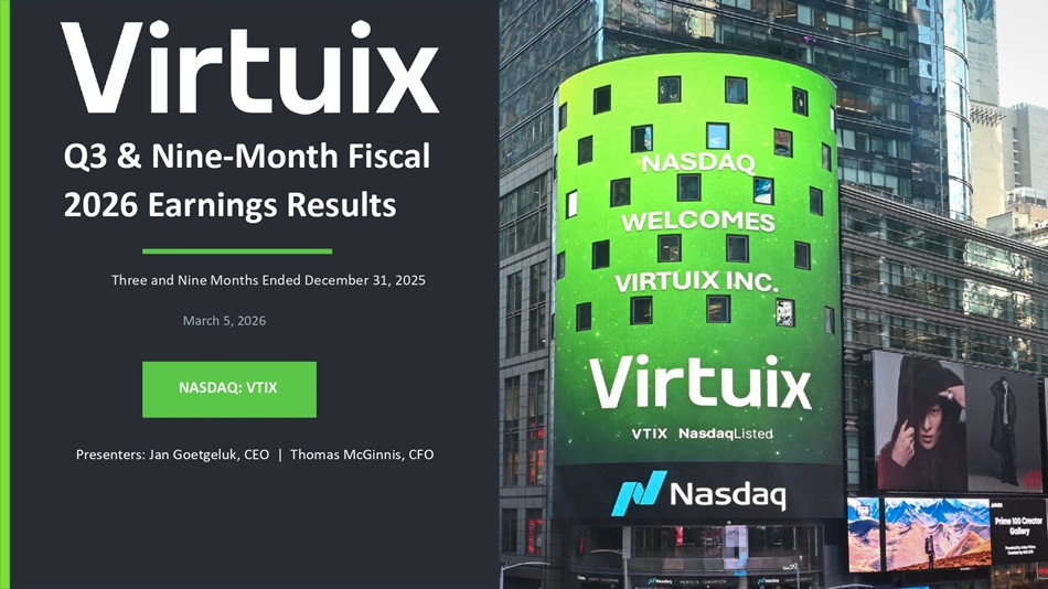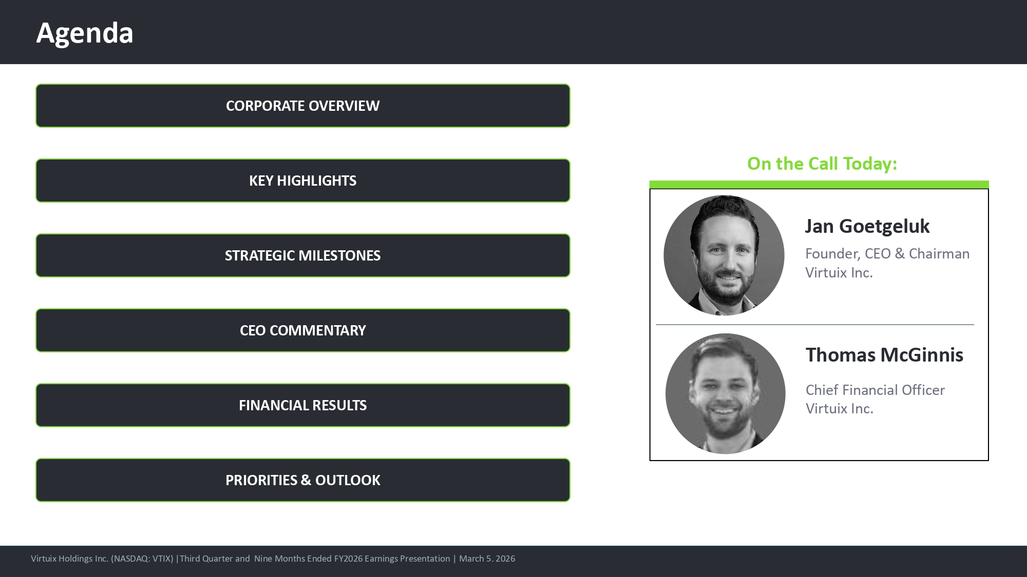 Agenda On the Call Today: CORPORATE OVERVIEW KEY HIGHLIGHTS STRATEGIC MILESTONES CEO COMMENTARY FINANCIAL RESULTS PRIORITIES & OUTLOOK Jan Goetgeluk Founder, CEO & Chairman Virtuix Inc. Thomas McGinnis Chief Financial Officer Virtuix Inc. Virtuix Holdings Inc. (NASDAQ: VTIX) |Third Quarter and Nine Months Ended FY2026 Earnings Presentation | March 5. 2026
