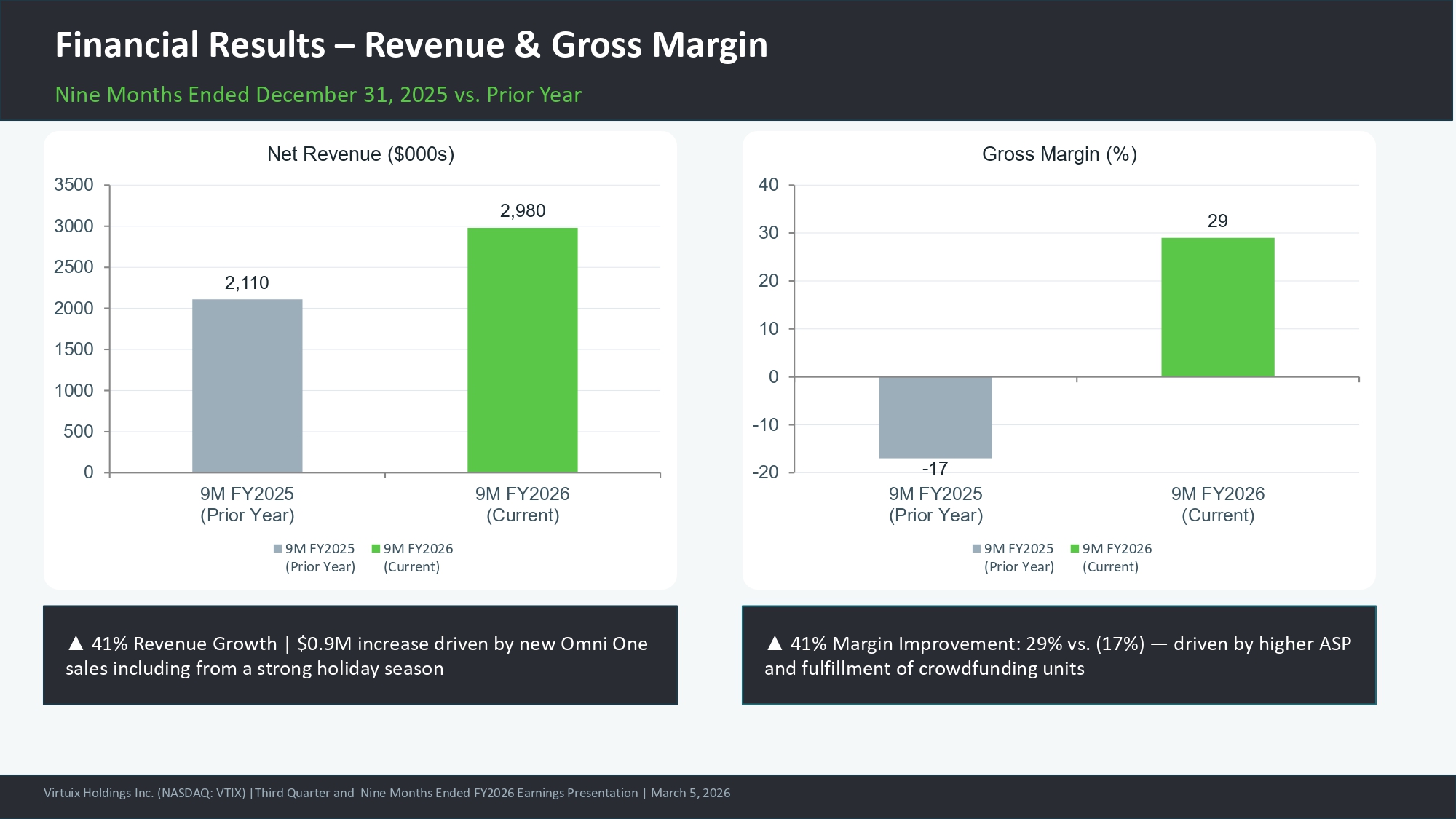 Financial Results – Revenue & Gross Margin Nine Months Ended December 31, 2025 vs. Prior Year 2,110 2,980 0 500 1000 1500 2000 2500 3000 3500 9M FY2026 (Current) Net Revenue ($000s) 9M FY2025 (Prior Year) 9M FY2025 (Prior Year) 9M FY2026 (Current) 29 - 17 - 20 - 10 0 10 20 30 40 9M FY2025 (Prior Year) 9M FY2026 (Current) Gross Margin (%) 9M FY2025 (Prior Year) 9M FY2026 (Current) Virtuix Holdings Inc. (NASDAQ: VTIX) |Third Quarter and Nine Months Ended FY2026 Earnings Presentation | March 5, 2026 წ 41% Revenue Growth | $0.9M increase driven by new Omni One sales including from a strong holiday season წ 41% Margin Improvement: 29% vs. (17%) — driven by higher ASP and fulfillment of crowdfunding units