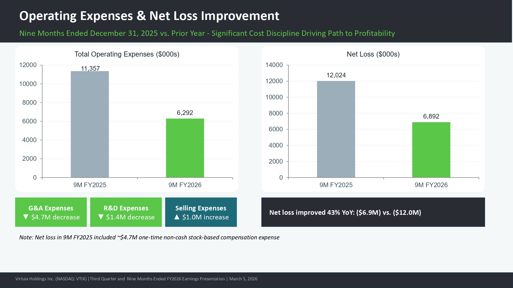 Operating Expenses & Net Loss Improvement 11,357 6,292 0 2000 4000 6000 8000 10000 9M FY2025 9M FY2026 12,024 6,892 0 2000 4000 6000 8000 10000 12000 12000 14000 9M FY2025 9M FY2026 Nine Months Ended December 31, 2025 vs. Prior Year - Significant Cost Discipline Driving Path to Profitability Total Operating Expenses ($000s) Net Loss ($000s) G&A Expenses ხ $4.7M decrease R&D Expenses ხ $1.4M decrease Selling Expenses წ $1.0M increase Virtuix Holdings Inc. (NASDAQ: VTIX) |Third Quarter and Nine Months Ended FY2026 Earnings Presentation | March 5, 2026 Note: Net loss in 9M FY2025 included ~$4.7M one - time non - cash stock - based compensation expense Net loss improved 43% YoY: ($6.9M) vs. ($12.0M)