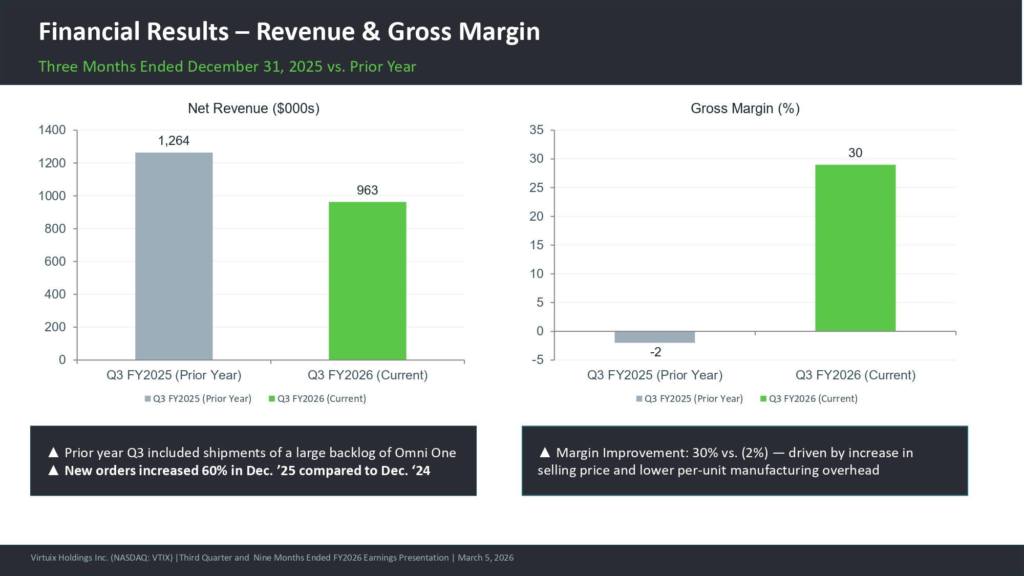 Financial Results – Revenue & Gross Margin Three Months Ended December 31, 2025 vs. Prior Year 1,264 963 0 200 400 600 800 1000 1200 1400 Q3 FY2026 (Current) Q3 FY2026 (Current) Net Revenue ($000s) Q3 FY2025 (Prior Year) Q3 FY2025 (Prior Year) - 2 30 - 5 0 5 10 15 20 25 30 35 Q3 FY2026 (Current) Q3 FY2026 (Current) Gross Margin (%) Q3 FY2025 (Prior Year) Q3 FY2025 (Prior Year) წ Prior year Q3 included shipments of a large backlog of Omni One წ New orders increased 60% in Dec. ’25 compared to Dec. ‘24 Virtuix Holdings Inc. (NASDAQ: VTIX) |Third Quarter and Nine Months Ended FY2026 Earnings Presentation | March 5, 2026 წ Margin Improvement: 30% vs. (2%) — driven by increase in selling price and lower per - unit manufacturing overhead