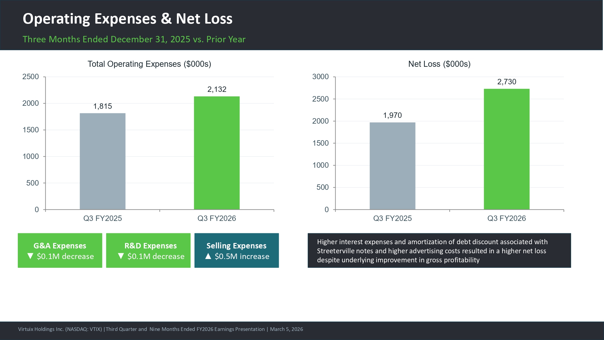 Operating Expenses & Net Loss Three Months Ended December 31, 2025 vs. Prior Year 1,815 2,132 0 500 1000 1500 2000 2500 Q3 FY2025 Q3 FY2026 Total Operating Expenses ($000s) 1,970 2,730 0 500 1000 1500 2000 2500 3000 Q3 FY2025 Q3 FY2026 Net Loss ($000s) G&A Expenses ხ $0.1M decrease R&D Expenses ხ $0.1M decrease Selling Expenses წ $0.5M increase Virtuix Holdings Inc. (NASDAQ: VTIX) |Third Quarter and Nine Months Ended FY2026 Earnings Presentation | March 5, 2026 Higher interest expenses and amortization of debt discount associated with Streeterville notes and higher advertising costs resulted in a higher net loss despite underlying improvement in gross profitability