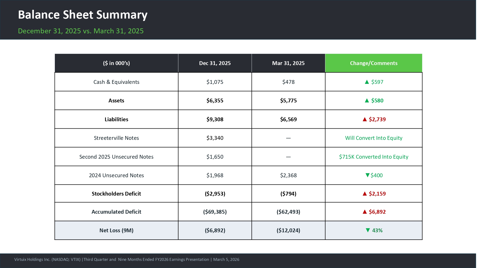 Balance Sheet Summary Virtuix Holdings Inc. (NASDAQ: VTIX) |Third Quarter and Nine Months Ended FY2026 Earnings Presentation | March 5, 2026 Change/Comments Mar 31, 2025 Dec 31, 2025 ($ in 000’s) წ $597 $478 $1,075 Cash & Equivalents Ÿ $580 $5,775 $6,355 Assets Ÿ $2,739 $6,569 $9,308 Liabilities Will Convert Into Equity — $3,340 Streeterville Notes $715K Converted Into Equity — $1,650 Second 2025 Unsecured Notes ხ $400 $2,368 $1,968 2024 Unsecured Notes Ÿ $2,159 ($794) ($2,953) Stockholders Deficit წ $6,892 ($62,493) ($69,385) Accumulated Deficit ხ 43% ($12,024) ($6,892) Net Loss (9M) December 31, 2025 vs. March 31, 2025