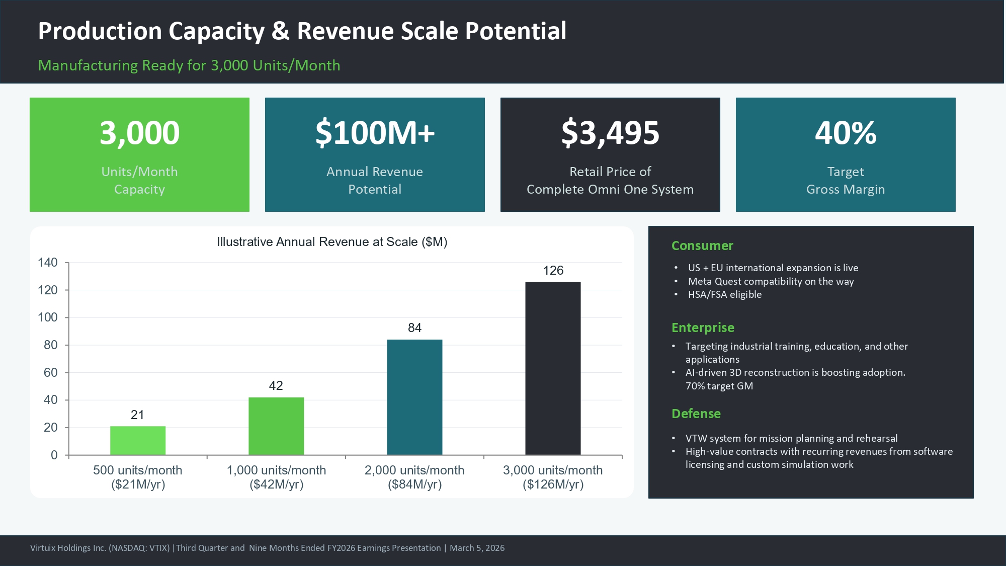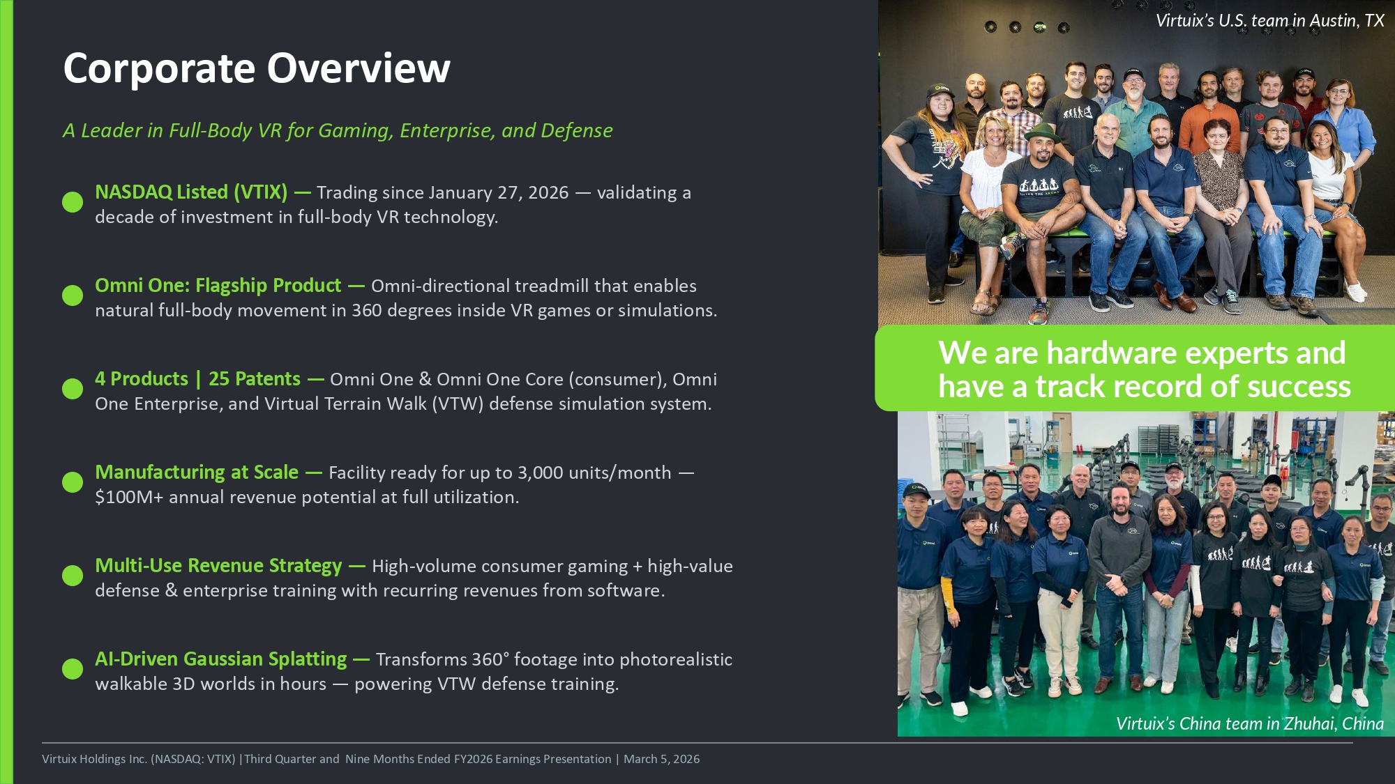 Corporate Overview A Leader in Full - Body VR for Gaming, Enterprise, and Defense NASDAQ Listed (VTIX) — Trading since January 27, 2026 — validating a decade of investment in full - body VR technology. Omni One: Flagship Product — Omni - directional treadmill that enables natural full - body movement in 360 degrees inside VR games or simulations. 4 Products | 25 Patents — Omni One & Omni One Core (consumer), Omni One Enterprise, and Virtual Terrain Walk (VTW) defense simulation system. Manufacturing at Scale — Facility ready for up to 3,000 units/month — $100M+ annual revenue potential at full utilization. Multi - Use Revenue Strategy — High - volume consumer gaming + high - value defense & enterprise training with recurring revenues from software. AI - Driven Gaussian Splatting — Transforms 360 Σ footage into photorealistic walkable 3D worlds in hours — powering VTW defense training. Virtuix’s China team in Zhuhai, China Virtuix’s U.S. team in Austin, TX We are hardware experts and have a track record of success Virtuix Holdings Inc. (NASDAQ: VTIX) |Third Quarter and Nine Months Ended FY2026 Earnings Presentation | March 5, 2026