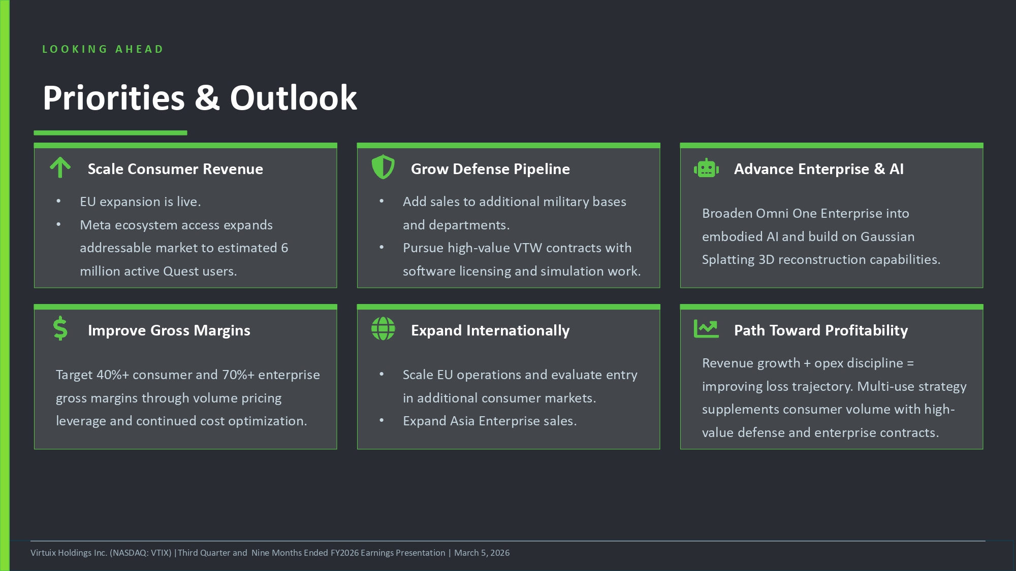L O O K I N G A H E A D Priorities & Outlook Scale Consumer Revenue • EU expansion is live. • Meta ecosystem access expands addressable market to estimated 6 million active Quest users. Grow Defense Pipeline • Add sales to additional military bases and departments. • Pursue high - value VTW contracts with software licensing and simulation work. Advance Enterprise & AI Broaden Omni One Enterprise into embodied AI and build on Gaussian Splatting 3D reconstruction capabilities. Improve Gross Margins Target 40%+ consumer and 70%+ enterprise gross margins through volume pricing leverage and continued cost optimization. Expand Internationally • Scale EU operations and evaluate entry in additional consumer markets. • Expand Asia Enterprise sales. Path Toward Profitability Revenue growth + opex discipline = improving loss trajectory. Multi - use strategy supplements consumer volume with high - value defense and enterprise contracts. Virtuix Holdings Inc. (NASDAQ: VTIX) |Third Quarter and Nine Months Ended FY2026 Earnings Presentation | March 5, 2026