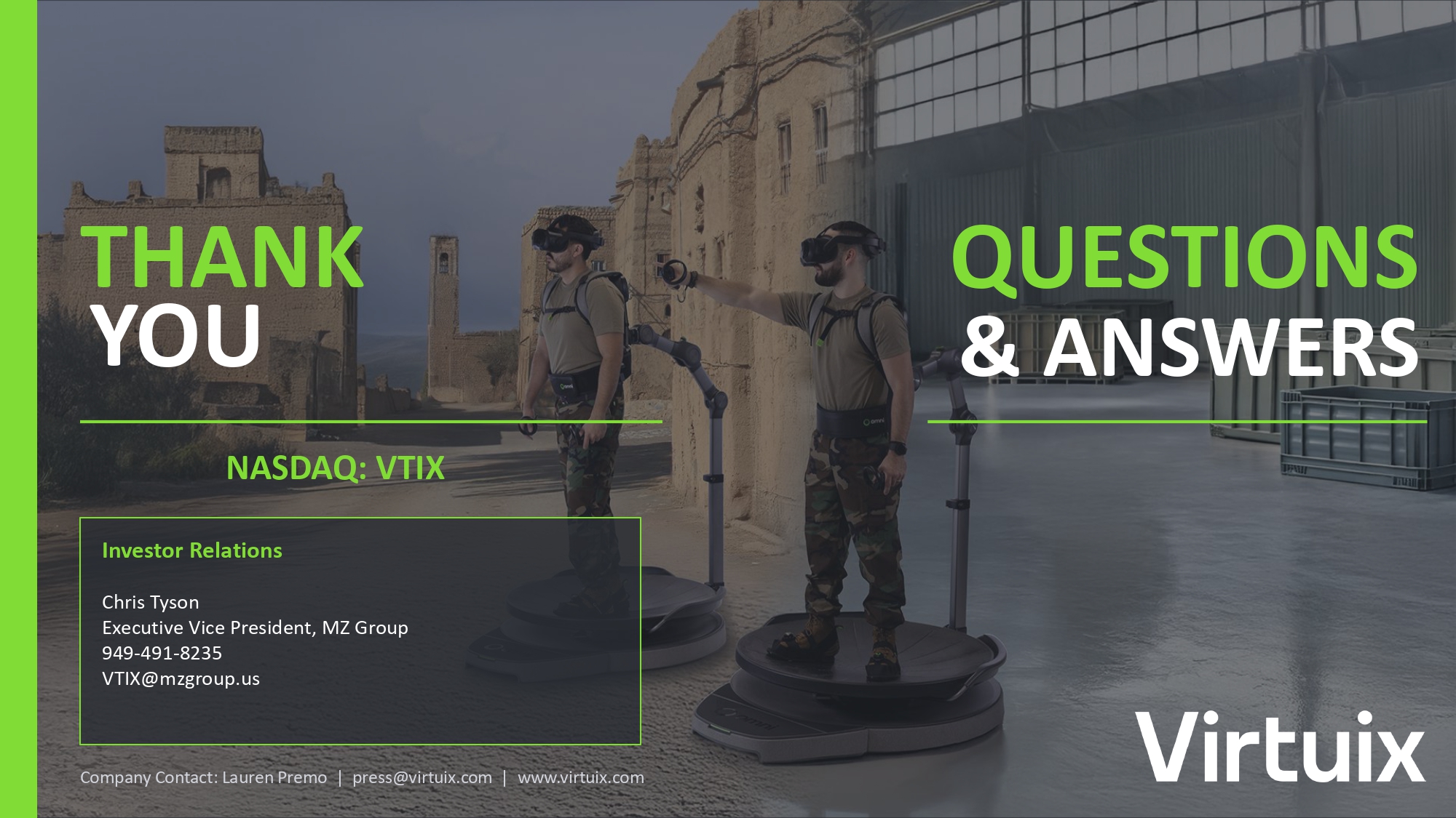 THANK YOU NASDAQ: VTIX Investor Relations Chris Tyson Executive Vice President, MZ Group 949 - 491 - 8235 VTIX@mzgroup.us Company Contact: Lauren Premo | press@virtuix.com | www.virtuix.com QUESTIONS & ANSWERS