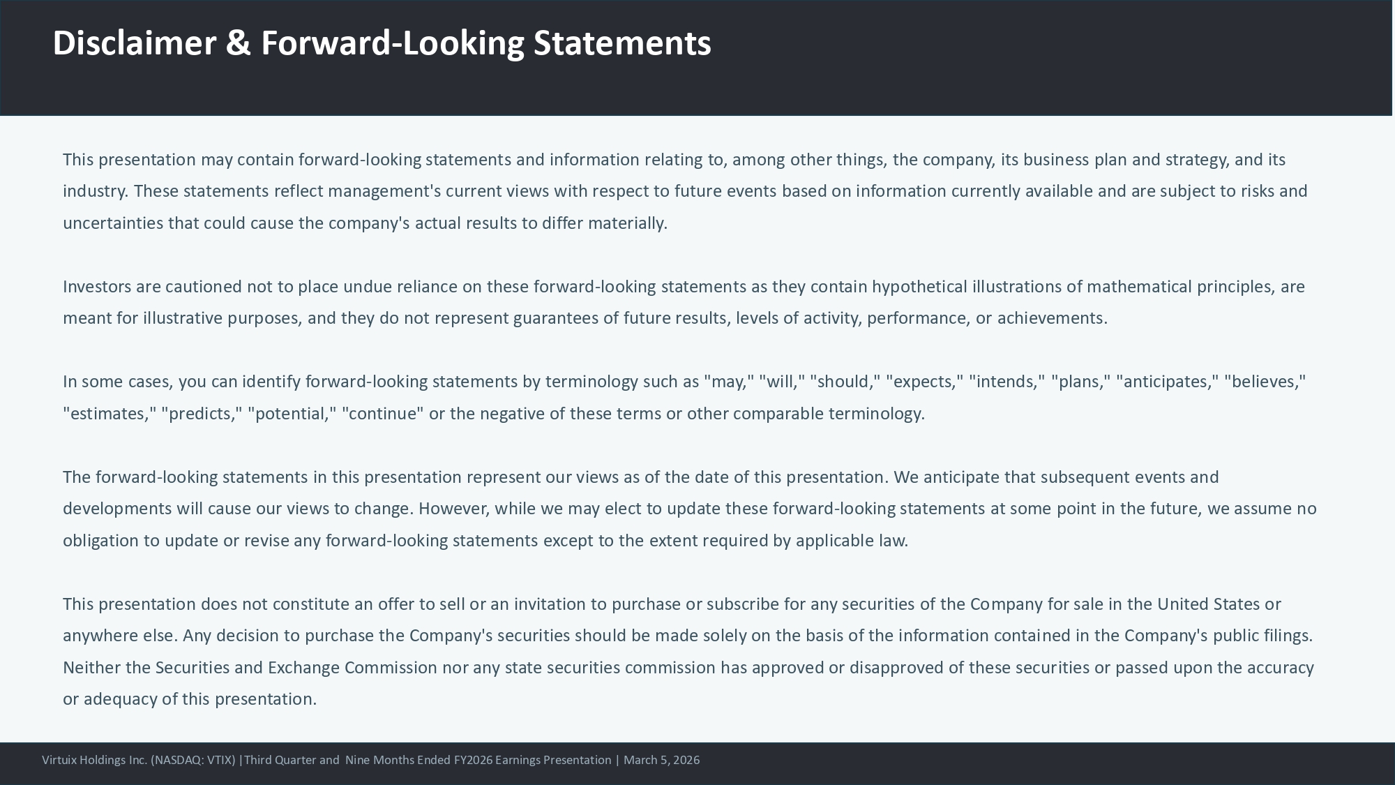 Disclaimer & Forward - Looking Statements This presentation may contain forward - looking statements and information relating to, among other things, the company, its business plan and strategy, and its industry. These statements reflect management's current views with respect to future events based on information currently available and are subject to risks and uncertainties that could cause the company's actual results to differ materially. Investors are cautioned not to place undue reliance on these forward - looking statements as they contain hypothetical illustrations of mathematical principles, are meant for illustrative purposes, and they do not represent guarantees of future results, levels of activity, performance, or achievements. In some cases, you can identify forward - looking statements by terminology such as "may," "will," "should," "expects," "intends," "plans," "anticipates," "believes," "estimates," "predicts," "potential," "continue" or the negative of these terms or other comparable terminology. The forward - looking statements in this presentation represent our views as of the date of this presentation. We anticipate that subsequent events and developments will cause our views to change. However, while we may elect to update these forward - looking statements at some point in the future, we assume no obligation to update or revise any forward - looking statements except to the extent required by applicable law. This presentation does not constitute an offer to sell or an invitation to purchase or subscribe for any securities of the Company for sale in the United States or anywhere else. Any decision to purchase the Company's securities should be made solely on the basis of the information contained in the Company's public filings. Neither the Securities and Exchange Commission nor any state securities commission has approved or disapproved of these securities or passed upon the accuracy or adequacy of this presentation. Virtuix Holdings Inc. (NASDAQ: VTIX) |Third Quarter and Nine Months Ended FY2026 Earnings Presentation | March 5, 2026