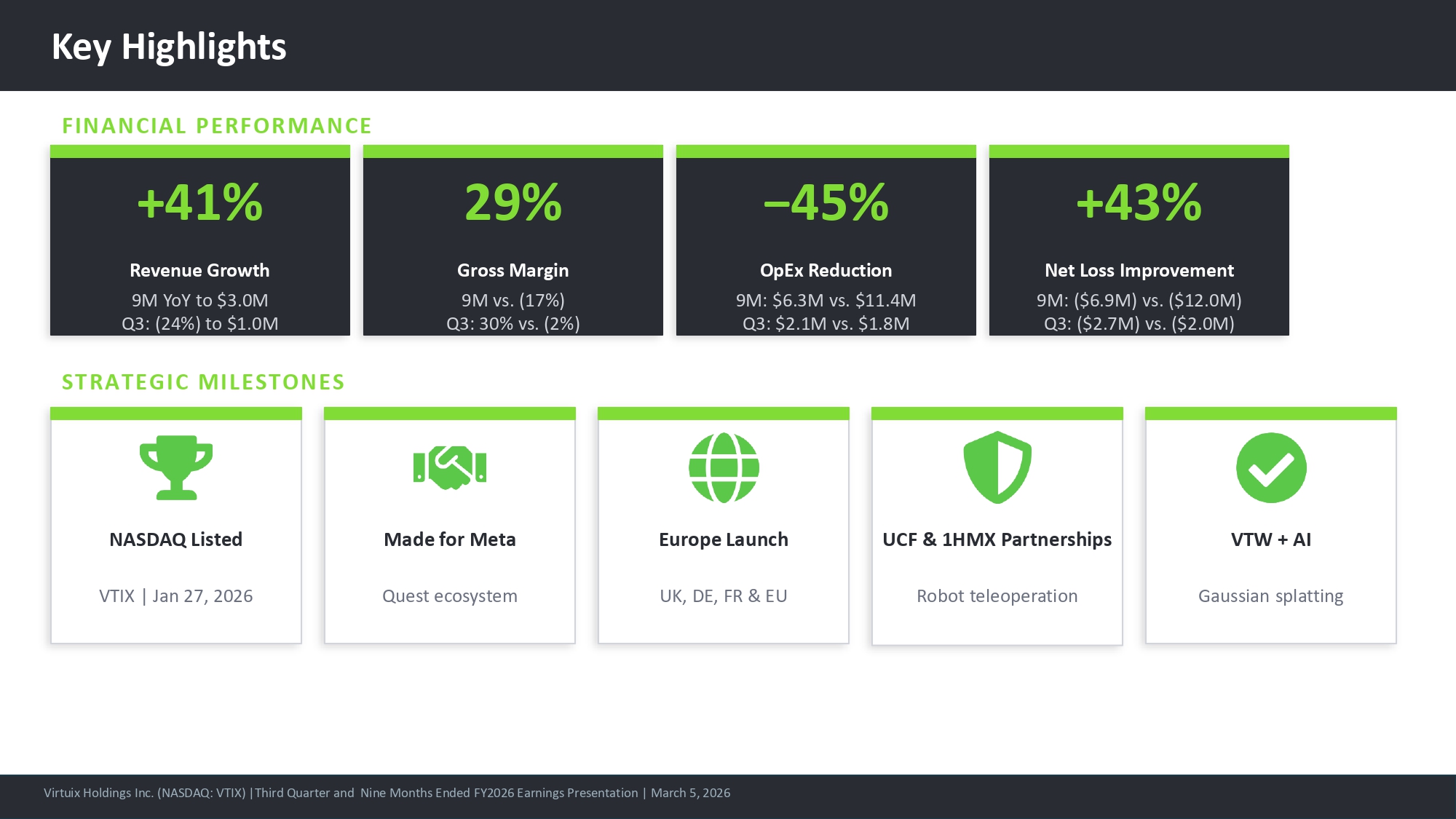 Key Highlights FINANCIAL PERFORMANCE +41% Revenue Growth 9M YoY to $3.0M Q3: (24%) to $1.0M 29% Gross Margin 9M vs. (17%) Q3: 30% vs. (2%) −45% OpEx Reduction 9M: $6.3M vs. $11.4M Q3: $2.1M vs. $1.8M +43% Net Loss Improvement 9M: ($6.9M) vs. ($12.0M) Q3: ($2.7M) vs. ($2.0M) STRATEGIC MILESTONES NASDAQ Listed VTIX | Jan 27, 2026 Made for Meta Quest ecosystem Europe Launch UK, DE, FR & EU UCF & 1HMX Partnerships Robot teleoperation VTW + AI Virtuix Holdings Inc. (NASDAQ: VTIX) |Third Quarter and Nine Months Ended FY2026 Earnings Presentation | March 5, 2026 Gaussian splatting