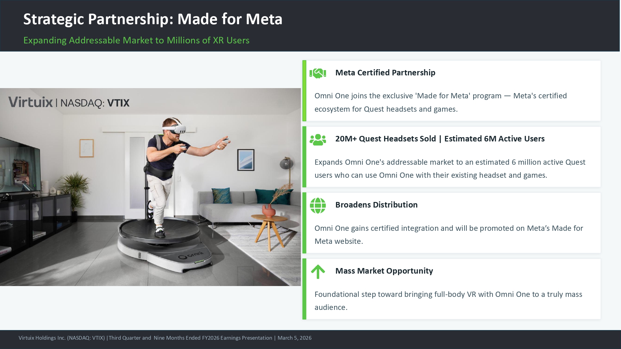 Strategic Partnership: Made for Meta Expanding Addressable Market to Millions of XR Users Meta Certified Partnership Omni One joins the exclusive 'Made for Meta' program — Meta's certified ecosystem for Quest headsets and games. 20M+ Quest Headsets Sold | Estimated 6M Active Users Expands Omni One's addressable market to an estimated 6 million active Quest users who can use Omni One with their existing headset and games. Broadens Distribution Omni One gains certified integration and will be promoted on Meta’s Made for Meta website. Mass Market Opportunity Foundational step toward bringing full - body VR with Omni One to a truly mass audience. Virtuix Holdings Inc. (NASDAQ: VTIX) |Third Quarter and Nine Months Ended FY2026 Earnings Presentation | March 5, 2026