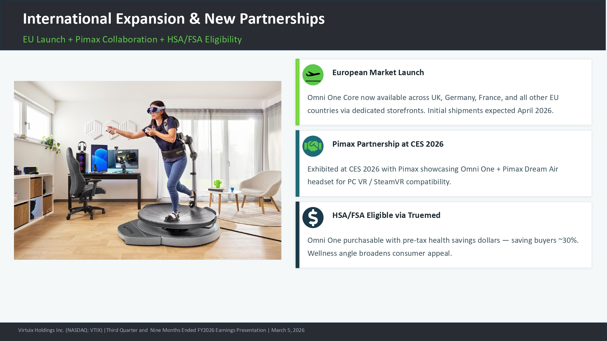 International Expansion & New Partnerships EU Launch + Pimax Collaboration + HSA/FSA Eligibility European Market Launch Omni One Core now available across UK, Germany, France, and all other EU countries via dedicated storefronts. Initial shipments expected April 2026. Pimax Partnership at CES 2026 Exhibited at CES 2026 with Pimax showcasing Omni One + Pimax Dream Air headset for PC VR / SteamVR compatibility. HSA/FSA Eligible via Truemed Omni One purchasable with pre - tax health savings dollars — saving buyers ~30%. Wellness angle broadens consumer appeal. Virtuix Holdings Inc. (NASDAQ: VTIX) |Third Quarter and Nine Months Ended FY2026 Earnings Presentation | March 5, 2026
