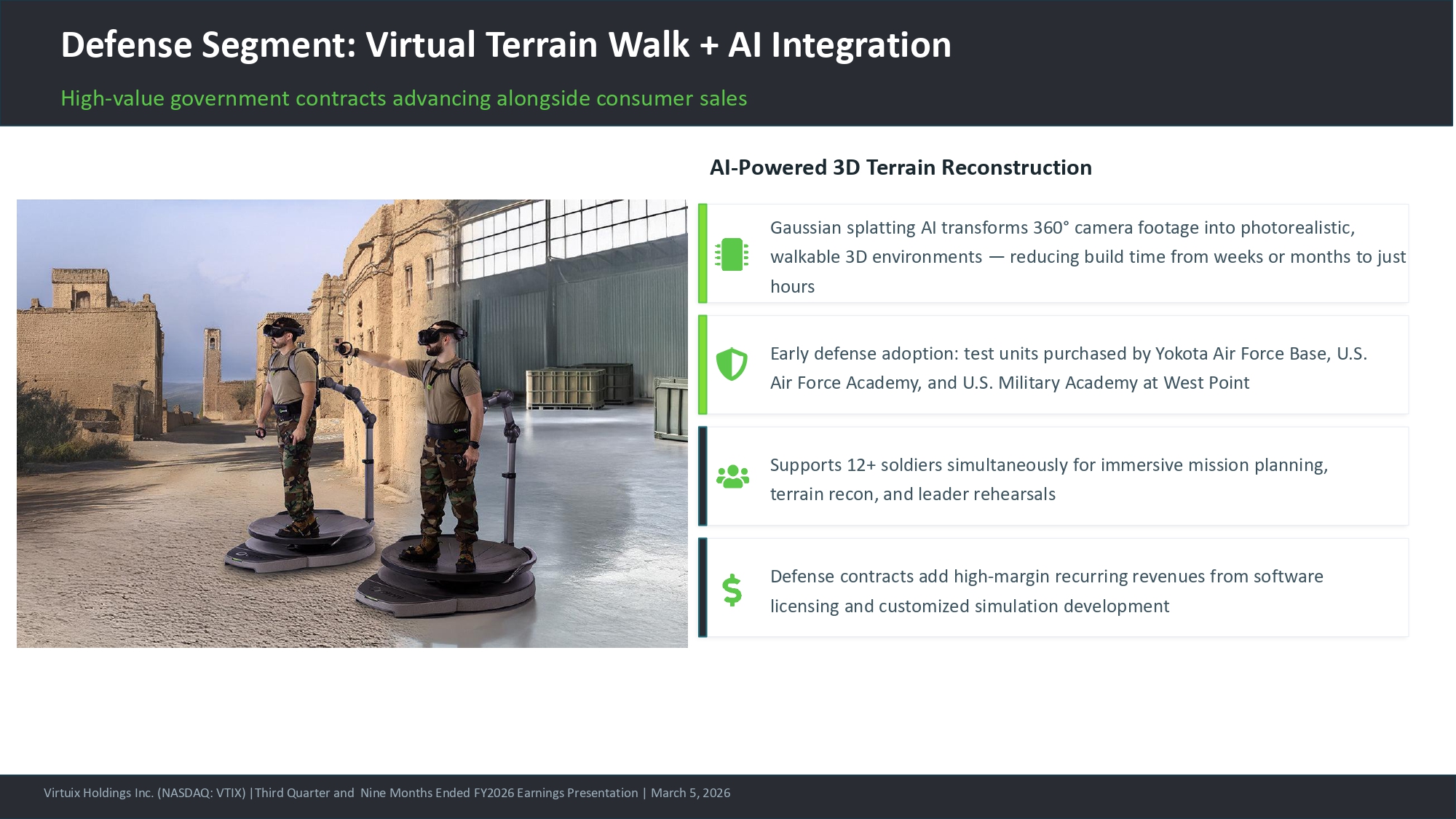 Defense Segment: Virtual Terrain Walk + AI Integration High - value government contracts advancing alongside consumer sales AI - Powered 3D Terrain Reconstruction Gaussian splatting AI transforms 360 Σ camera footage into photorealistic, walkable 3D environments — reducing build time from weeks or months to just hours Early defense adoption: test units purchased by Yokota Air Force Base, U.S. Air Force Academy, and U.S. Military Academy at West Point Supports 12+ soldiers simultaneously for immersive mission planning, terrain recon, and leader rehearsals Defense contracts add high - margin recurring revenues from software licensing and customized simulation development Virtuix Holdings Inc. (NASDAQ: VTIX) |Third Quarter and Nine Months Ended FY2026 Earnings Presentation | March 5, 2026