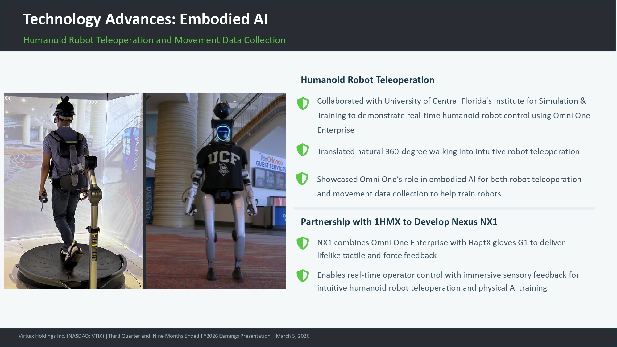 Technology Advances: Embodied AI Humanoid Robot Teleoperation and Movement Data Collection Humanoid Robot Teleoperation Collaborated with University of Central Florida's Institute for Simulation & Training to demonstrate real - time humanoid robot control using Omni One Enterprise Translated natural 360 - degree walking into intuitive robot teleoperation Showcased Omni One’s role in embodied AI for both robot teleoperation and movement data collection to help train robots Partnership with 1HMX to Develop Nexus NX1 NX1 combines Omni One Enterprise with HaptX gloves G1 to deliver lifelike tactile and force feedback Enables real - time operator control with immersive sensory feedback for intuitive humanoid robot teleoperation and physical AI training Virtuix Holdings Inc. (NASDAQ: VTIX) |Third Quarter and Nine Months Ended FY2026 Earnings Presentation | March 5, 2026