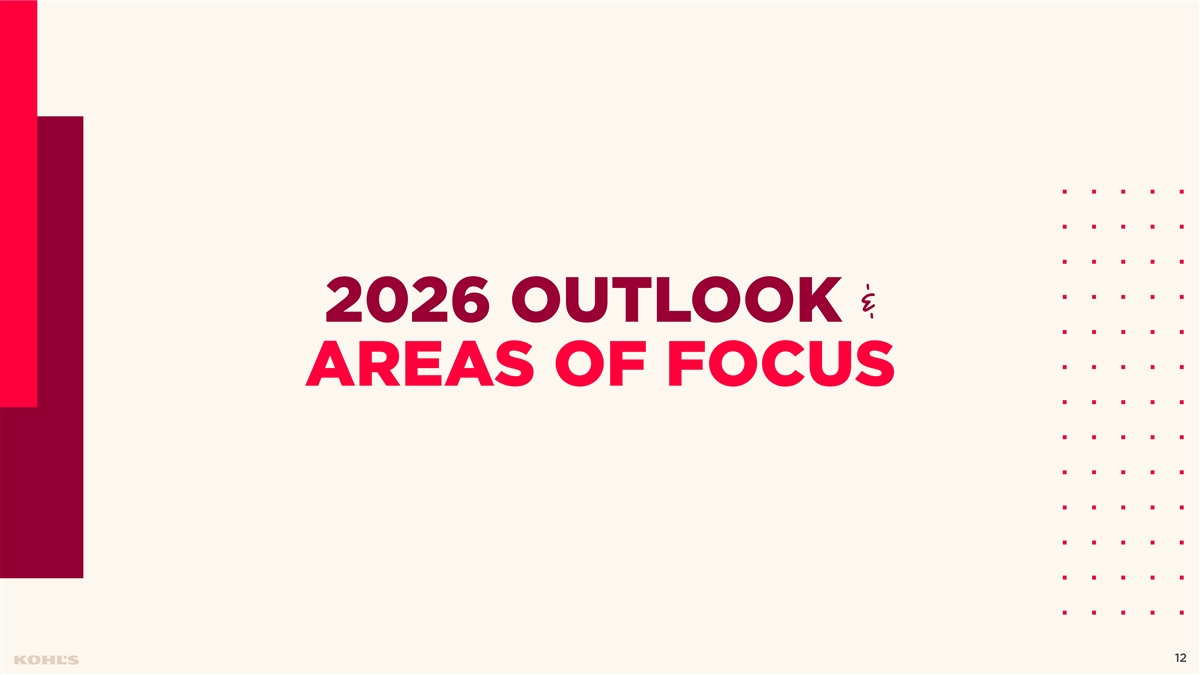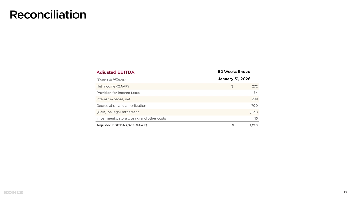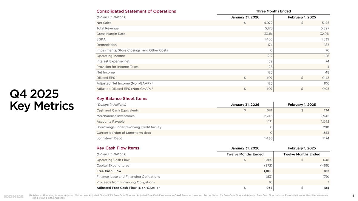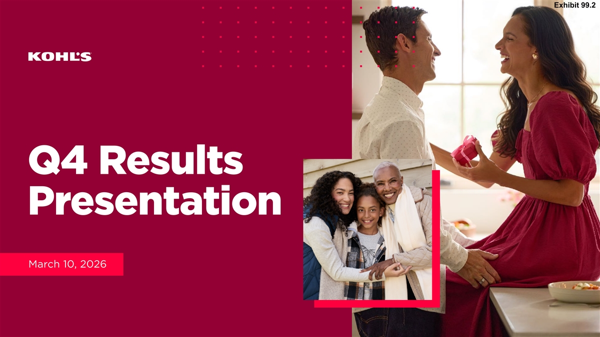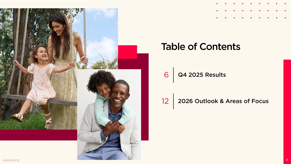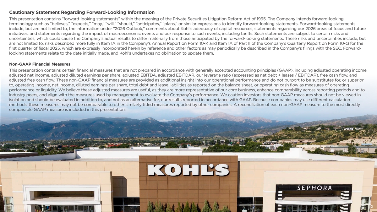 Cautionary Statement Regarding Forward-Looking Information This presentation contains “forward-looking statements” within the meaning of the Private Securities Litigation Reform Act of 1995. The Company intends forward-looking terminology such as “believes,” “expects,” “may,” “will,” “should,” “anticipates,” “plans,” or similar expressions to identify forward-looking statements. Forward-looking statements include, but are not limited to, the information under 2026 Outlook, comments about Kohl's adequacy of capital resources, statements regarding our 2026 areas of focus and future initiatives, and statements regarding the impact of macroeconomic events and our response to such events, including tariffs. Such statements are subject to certain risks and uncertainties, which could cause the Company's actual results to differ materially from those anticipated by the forward-looking statements. These risks and uncertainties include, but are not limited to, risks described more fully in Item 1A in the Company’s Annual Report on Form 10-K and Item 1A of Part II of the Company’s Quarterly Report on Form 10-Q for the first quarter of fiscal 2025, which are expressly incorporated herein by reference and other factors as may periodically be described in the Company’s filings with the SEC. Forward- looking statements relate to the date initially made, and Kohl’s undertakes no obligation to update them. Non-GAAP Financial Measures This presentation contains certain financial measures that are not prepared in accordance with generally accepted accounting principles (GAAP), including adjusted operating income, adjusted net income, adjusted diluted earnings per share, adjusted EBITDA, adjusted EBITDAR, our leverage ratio (expressed as net debt + leases / EBITDAR), free cash flow, and adjusted free cash flow. These non-GAAP financial measures are provided as additional insight into our operational performance and do not purport to be substitutes for, or superior to, operating income, net income, diluted earnings per share, total debt and lease liabilities as reported on the balance sheet, or operating cash flow as measures of operating performance or liquidity. We believe these adjusted measures are useful, as they are more representative of our core business, enhance comparability across reporting periods and to industry peers, and align with the measures used by management to evaluate the Company’s performance. We caution investors that non-GAAP measures should not be viewed in isolation and should be evaluated in addition to, and not as an alternative for, our results reported in accordance with GAAP. Because companies may use different calculation methods, these measures may not be comparable to other similarly titled measures reported by other companies. A reconciliation of each non-GAAP measure to the most directly comparable GAAP measure is included in this presentation. 2