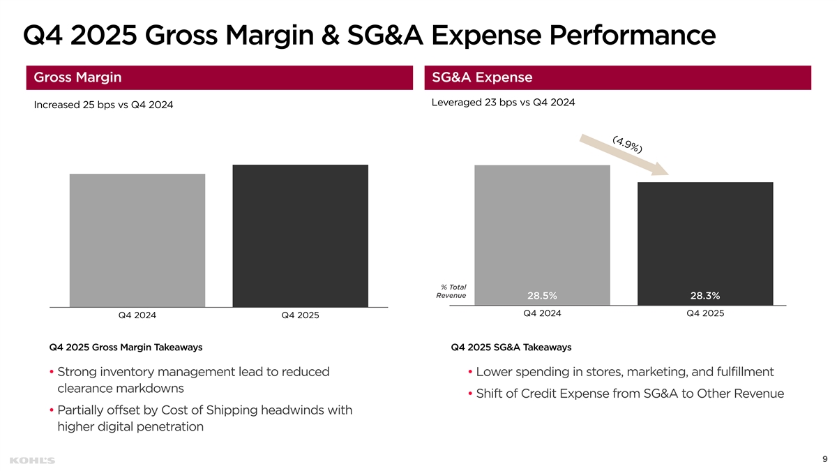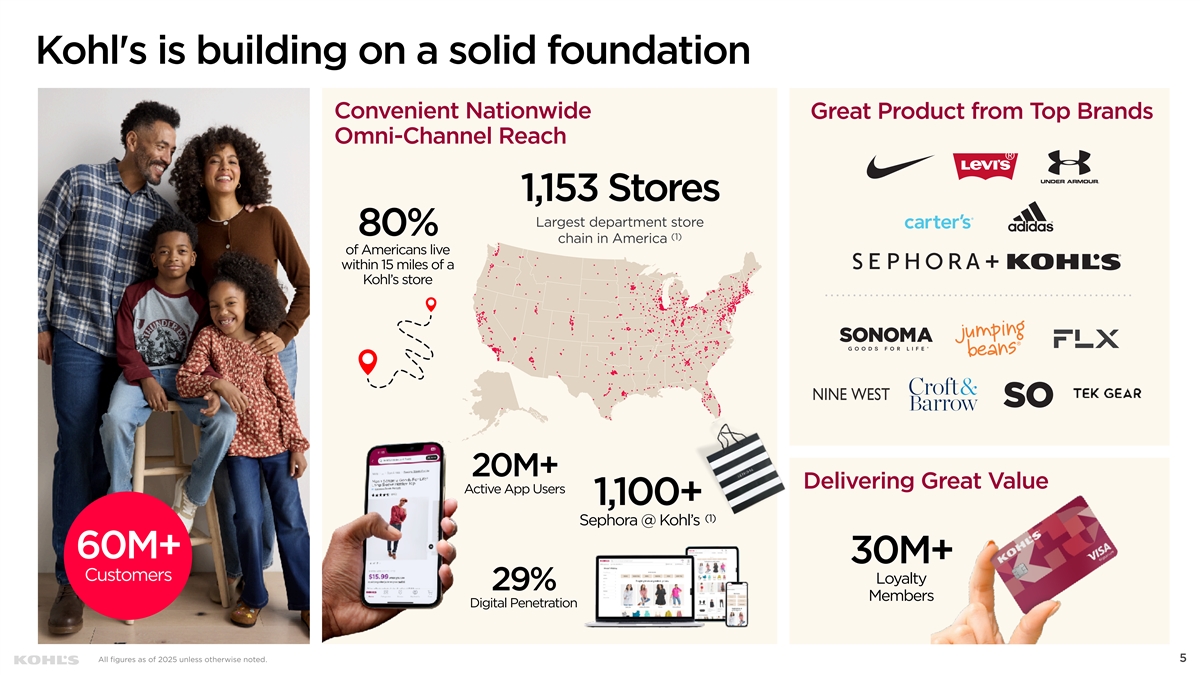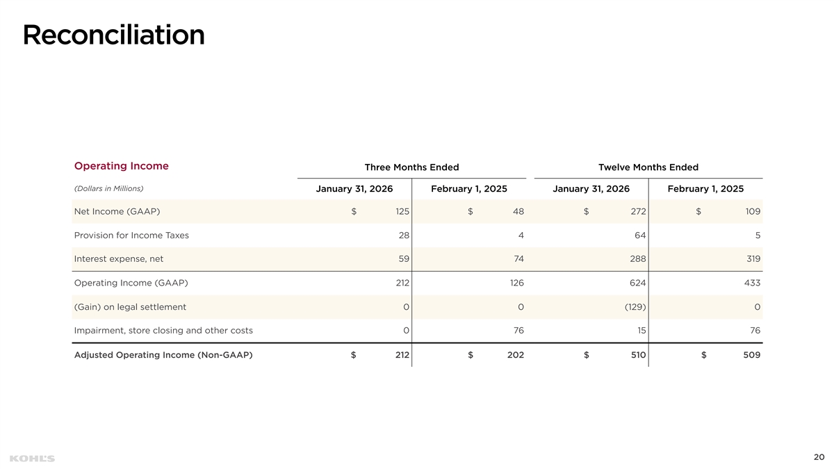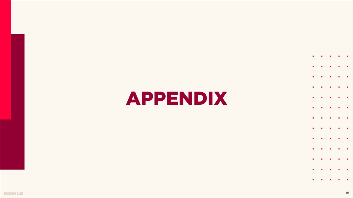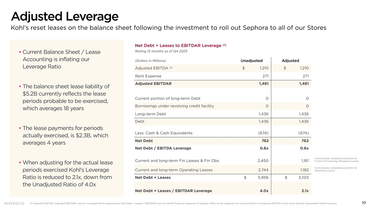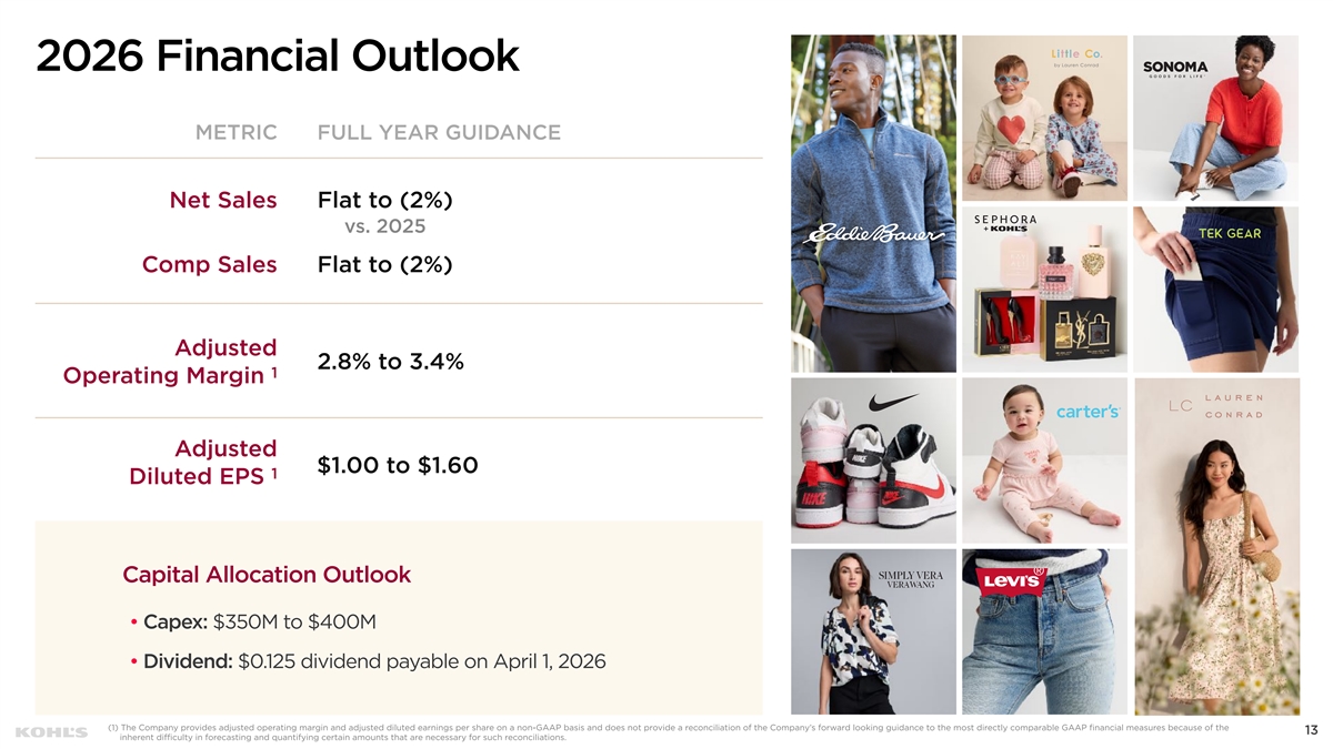 Cautionary Statement Regarding Forward-Looking Information This presentation contains “forward-looking statements” within the meaning of the Private Securities Litigation Reform Act of 1995. The Company intends forward-looking terminology such as “believes,” “expects,” “may,” “will,” “should,” “anticipates,” “plans,” or similar expressions to identify forward-looking statements. Forward-looking statements include, but are not limited to, the information under 2026 Outlook, comments about Kohl's adequacy of capital resources, statements regarding our 2026 areas of focus and future initiatives, and statements regarding the impact of macroeconomic events and our response to such events, including tariffs. Such statements are subject to certain risks and uncertainties, which could cause the Company's actual results to differ materially from those anticipated by the forward-looking statements. These risks and uncertainties include, but are not limited to, risks described more fully in Item 1A in the Company’s Annual Report on Form 10-K and Item 1A of Part II of the Company’s Quarterly Report on Form 10-Q for the first quarter of fiscal 2025, which are expressly incorporated herein by reference and other factors as may periodically be described in the Company’s filings with the SEC. Forward- looking statements relate to the date initially made, and Kohl’s undertakes no obligation to update them. Non-GAAP Financial Measures This presentation contains certain financial measures that are not prepared in accordance with generally accepted accounting principles (GAAP), including adjusted operating income, adjusted net income, adjusted diluted earnings per share, adjusted EBITDA, adjusted EBITDAR, our leverage ratio (expressed as net debt + leases / EBITDAR), free cash flow, and adjusted free cash flow. These non-GAAP financial measures are provided as additional insight into our operational performance and do not purport to be substitutes for, or superior to, operating income, net income, diluted earnings per share, total debt and lease liabilities as reported on the balance sheet, or operating cash flow as measures of operating performance or liquidity. We believe these adjusted measures are useful, as they are more representative of our core business, enhance comparability across reporting periods and to industry peers, and align with the measures used by management to evaluate the Company’s performance. We caution investors that non-GAAP measures should not be viewed in isolation and should be evaluated in addition to, and not as an alternative for, our results reported in accordance with GAAP. Because companies may use different calculation methods, these measures may not be comparable to other similarly titled measures reported by other companies. A reconciliation of each non-GAAP measure to the most directly comparable GAAP measure is included in this presentation. 2