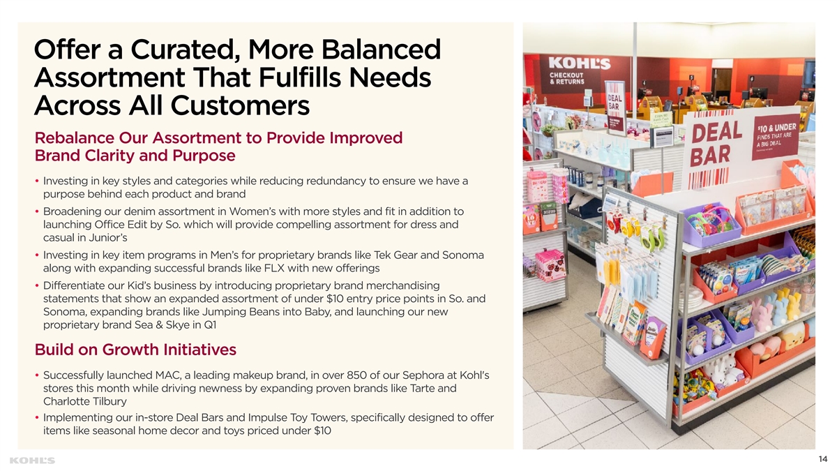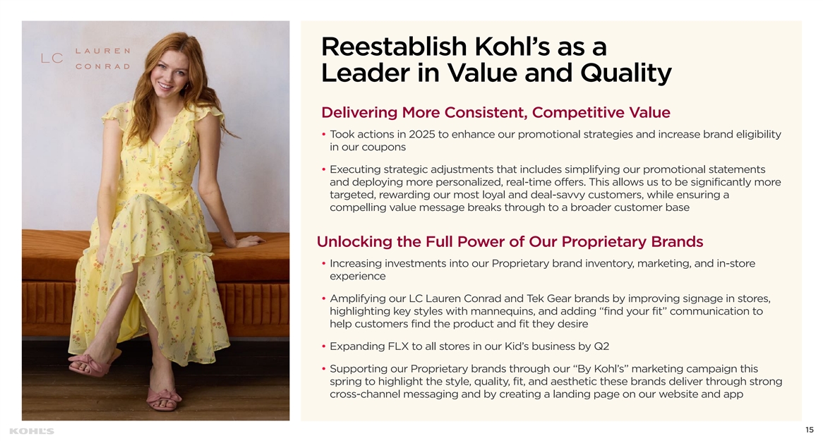 Offer a Curated, More Balanced Assortment That Fulfills Needs Across All Customers Rebalance Our Assortment to Provide Improved Brand Clarity and Purpose • Investing in key styles and categories while reducing redundancy to ensure we have a purpose behind each product and brand • Broadening our denim assortment in Women’s with more styles and fit in addition to launching Office Edit by So. which will provide compelling assortment for dress and casual in Junior’s • Investing in key item programs in Men’s for proprietary brands like Tek Gear and Sonoma along with expanding successful brands like FLX with new offerings • Differentiate our Kid’s business by introducing proprietary brand merchandising statements that show an expanded assortment of under $10 entry price points in So. and Sonoma, expanding brands like Jumping Beans into Baby, and launching our new proprietary brand Sea & Skye in Q1 Build on Growth Initiatives • Successfully launched MAC, a leading makeup brand, in over 850 of our Sephora at Kohl's stores this month while driving newness by expanding proven brands like Tarte and Charlotte Tilbury • Implementing our in-store Deal Bars and Impulse Toy Towers, specifically designed to offer items like seasonal home decor and toys priced under $10 14