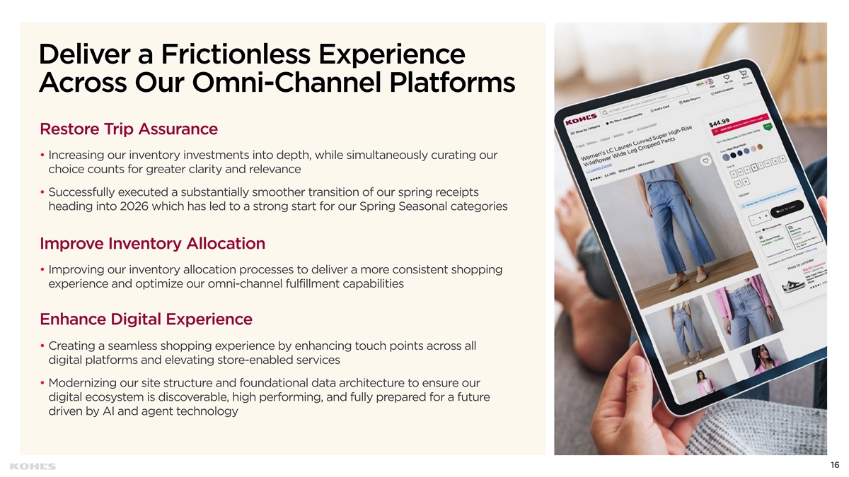 Reestablish Kohl’s as a Leader in Value and Quality Delivering More Consistent, Competitive Value • Took actions in 2025 to enhance our promotional strategies and increase brand eligibility in our coupons • Executing strategic adjustments that includes simplifying our promotional statements and deploying more personalized, real-time offers. This allows us to be significantly more targeted, rewarding our most loyal and deal-savvy customers, while ensuring a compelling value message breaks through to a broader customer base Unlocking the Full Power of Our Proprietary Brands • Increasing investments into our Proprietary brand inventory, marketing, and in-store experience • Amplifying our LC Lauren Conrad and Tek Gear brands by improving signage in stores, highlighting key styles with mannequins, and adding “find your fit” communication to help customers find the product and fit they desire • Expanding FLX to all stores in our Kid’s business by Q2 • Supporting our Proprietary brands through our “By Kohl’s” marketing campaign this spring to highlight the style, quality, fit, and aesthetic these brands deliver through strong cross-channel messaging and by creating a landing page on our website and app 15