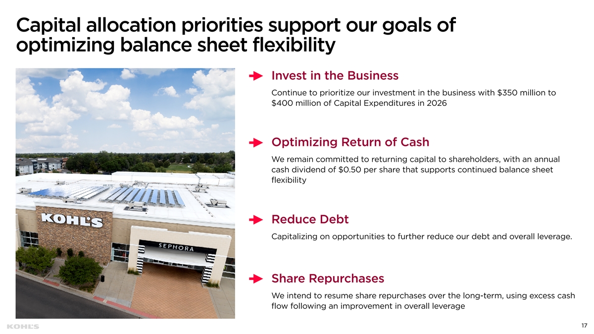 Deliver a Frictionless Experience Across Our Omni-Channel Platforms Restore Trip Assurance • Increasing our inventory investments into depth, while simultaneously curating our choice counts for greater clarity and relevance • Successfully executed a substantially smoother transition of our spring receipts heading into 2026 which has led to a strong start for our Spring Seasonal categories Improve Inventory Allocation • Improving our inventory allocation processes to deliver a more consistent shopping experience and optimize our omni-channel fulfillment capabilities Enhance Digital Experience • Creating a seamless shopping experience by enhancing touch points across all digital platforms and elevating store-enabled services • Modernizing our site structure and foundational data architecture to ensure our digital ecosystem is discoverable, high performing, and fully prepared for a future driven by AI and agent technology 16