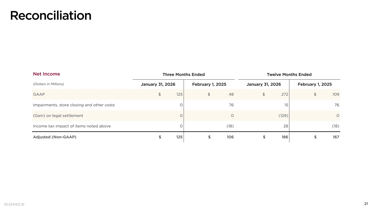 Reconciliation Operating Income Three Months Ended Twelve Months Ended (Dollars in Millions) January 31, 2026 February 1, 2025 January 31, 2026 February 1, 2025 Net Income (GAAP) $ 125 $ 48 $ 272 $ 109 Provision for Income Taxes 28 4 64 5 Interest expense, net 59 74 288 319 Operating Income (GAAP) 212 126 624 433 (Gain) on legal settlement 0 0 (129) 0 Impairment, store closing and other costs 0 76 15 76 Adjusted Operating Income (Non-GAAP) $ 212 $ 202 $ 510 $ 509 20