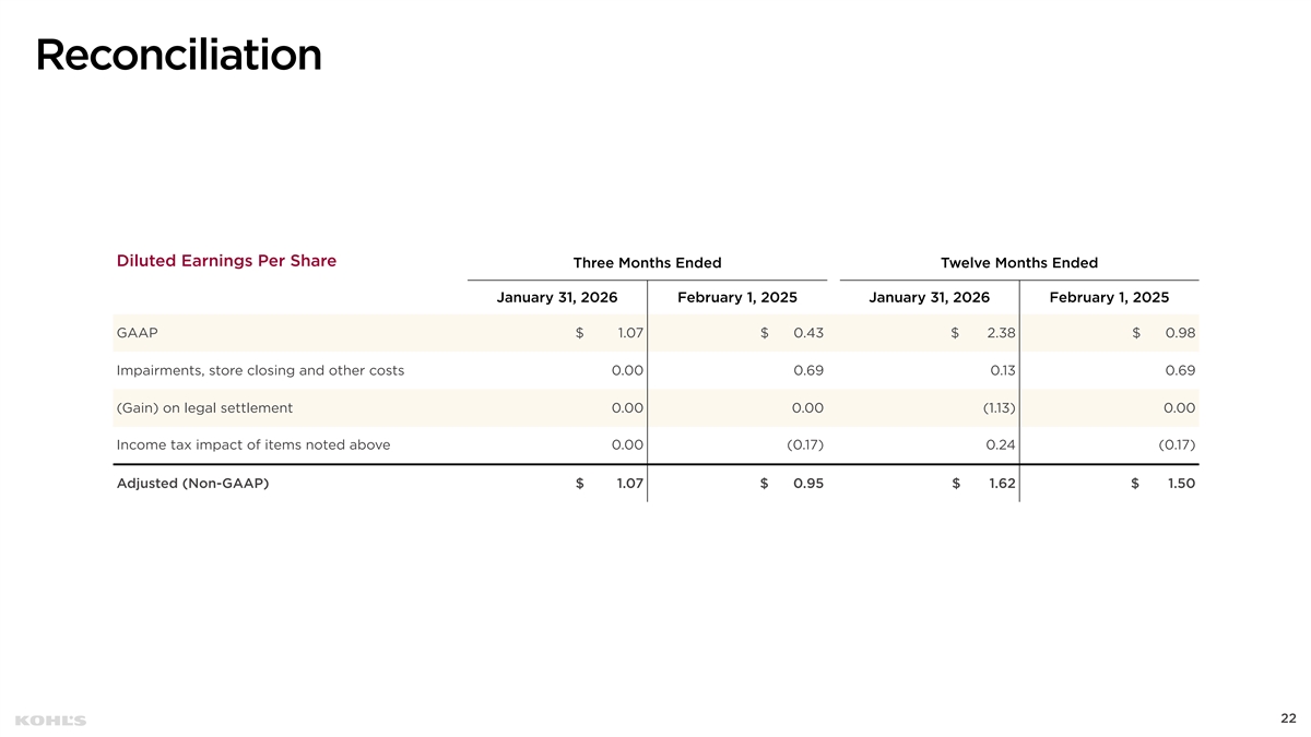 Reconciliation Net Income Three Months Ended Twelve Months Ended (Dollars in Millions) January 31, 2026 February 1, 2025 January 31, 2026 February 1, 2025 GAAP $ 125 $ 48 $ 272 $ 109 Impairments, store closing and other costs 0 76 15 76 (Gain) on legal settlement 0 0 (129) 0 Income tax impact of items noted above 0 (18) 28 (18) Adjusted (Non-GAAP) $ 125 $ 106 $ 186 $ 167 21