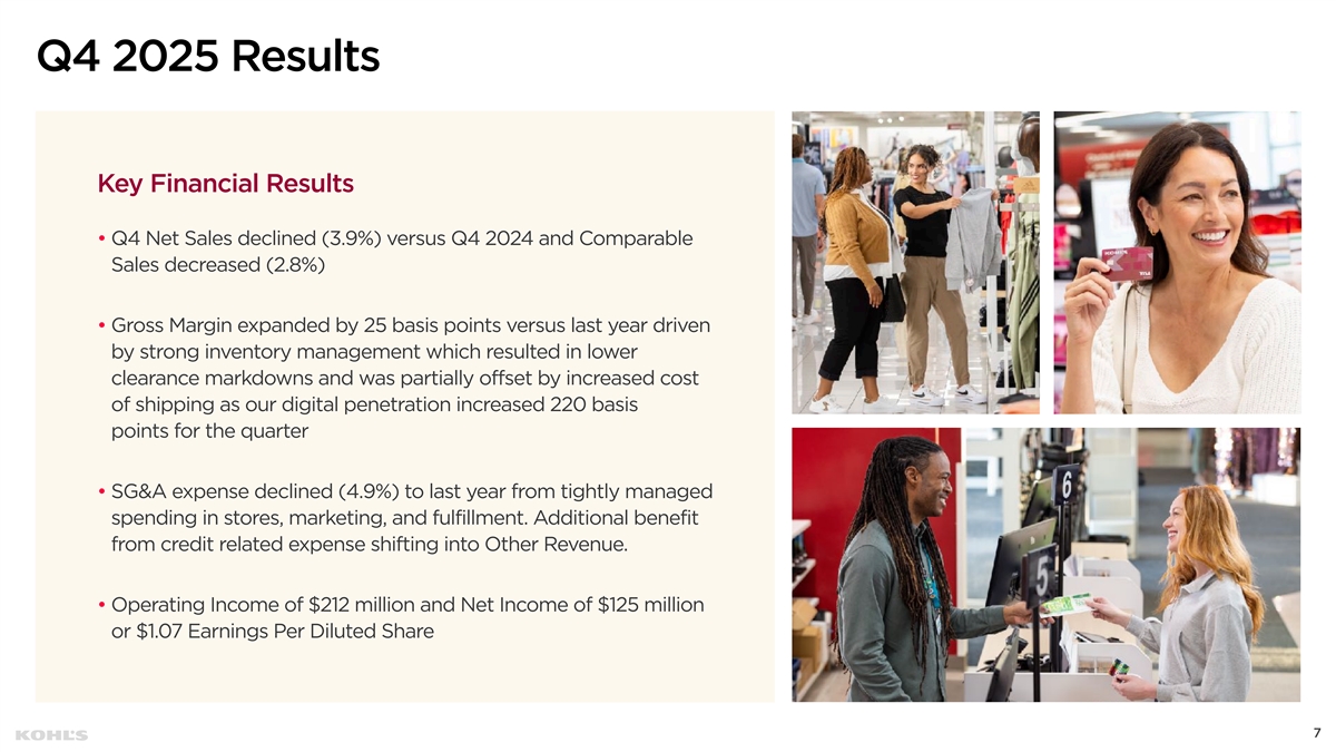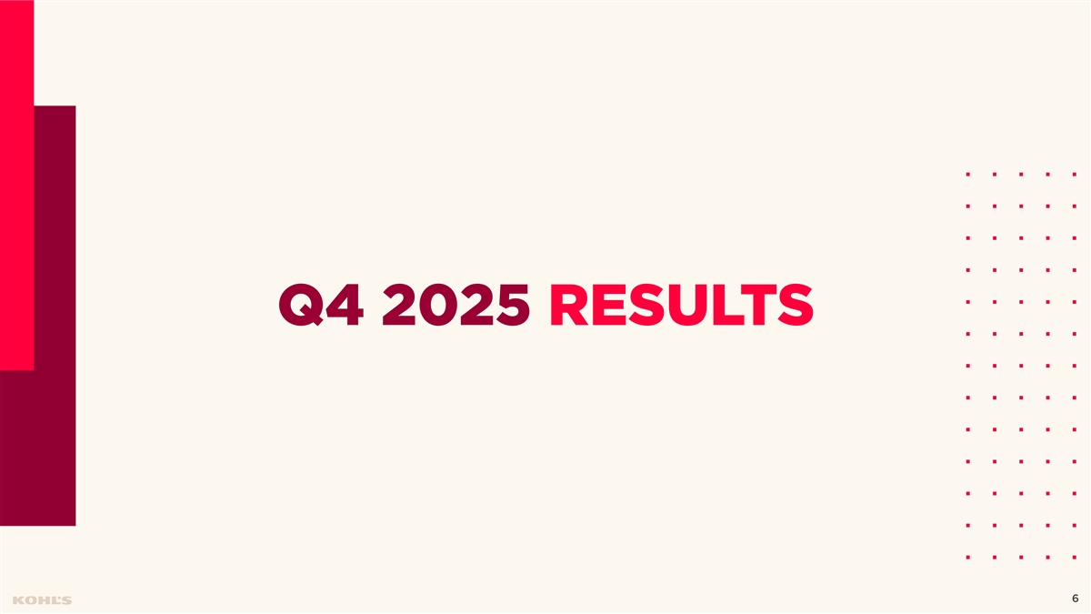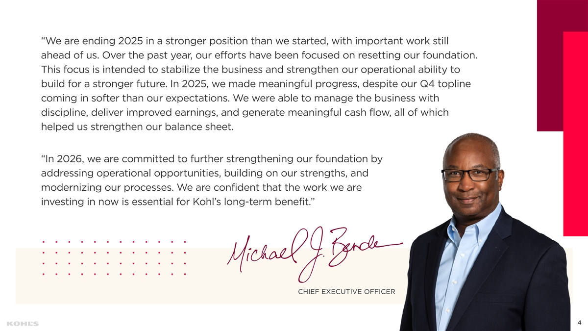 “We are ending 2025 in a stronger position than we started, with important work still ahead of us. Over the past year, our efforts have been focused on resetting our foundation. This focus is intended to stabilize the business and strengthen our operational ability to build for a stronger future. In 2025, we made meaningful progress, despite our Q4 topline coming in softer than our expectations. We were able to manage the business with discipline, deliver improved earnings, and generate meaningful cash flow, all of which helped us strengthen our balance sheet. “In 2026, we are committed to further strengthening our foundation by addressing operational opportunities, building on our strengths, and modernizing our processes. We are confident that the work we are investing in now is essential for Kohl’s long-term benefit.” CHIEF EXECUTIVE OFFICER 4
