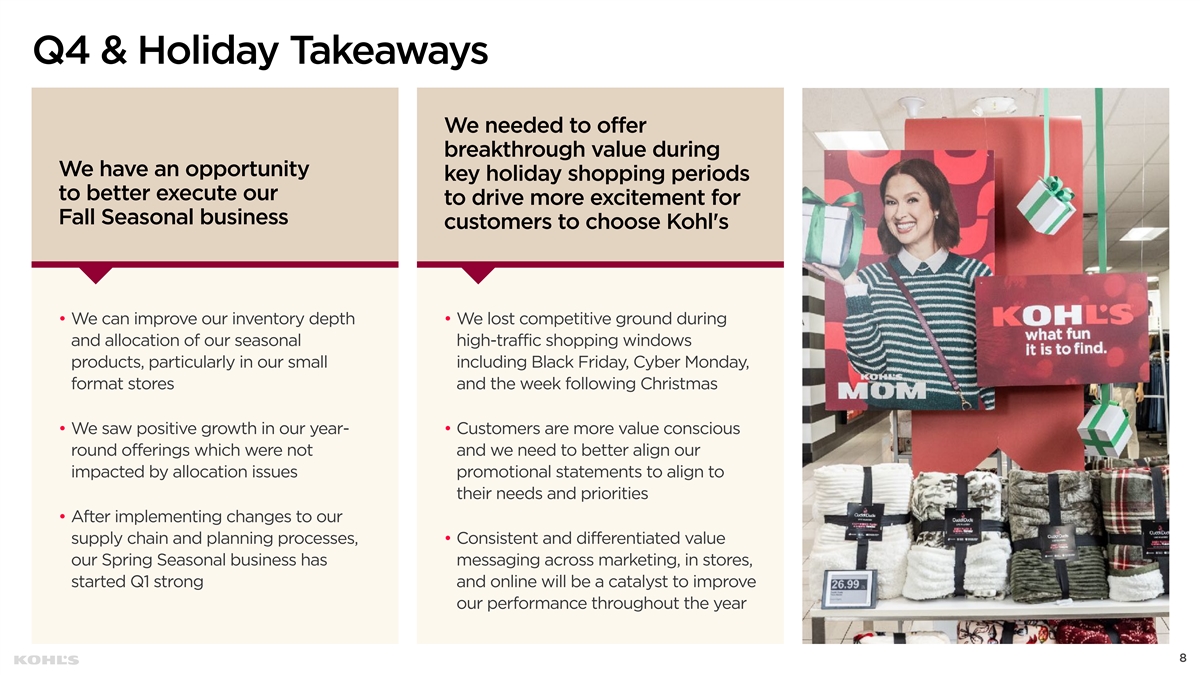 Q4 & Holiday Takeaways We needed to offer breakthrough value during We have an opportunity key holiday shopping periods to better execute our to drive more excitement for Fall Seasonal business customers to choose Kohl's • We can improve our inventory depth • We lost competitive ground during and allocation of our seasonal high-traffic shopping windows products, particularly in our small including Black Friday, Cyber Monday, format stores and the week following Christmas • We saw positive growth in our year- • Customers are more value conscious round offerings which were not and we need to better align our impacted by allocation issues promotional statements to align to their needs and priorities • After implementing changes to our supply chain and planning processes, • Consistent and differentiated value our Spring Seasonal business has messaging across marketing, in stores, started Q1 strong and online will be a catalyst to improve our performance throughout the year 8