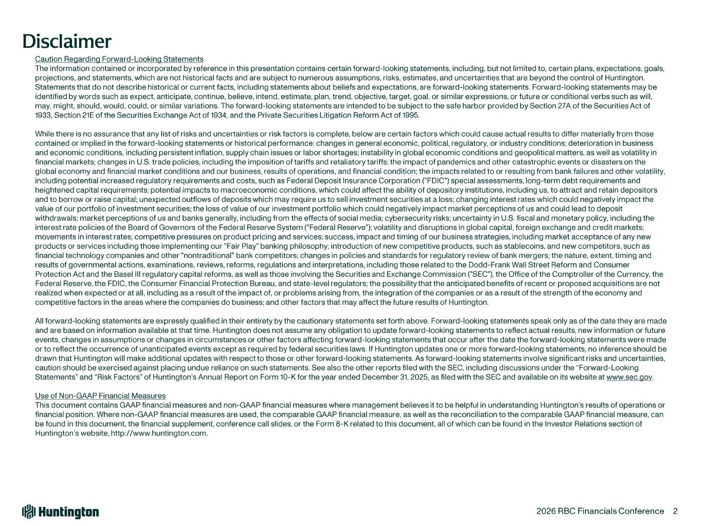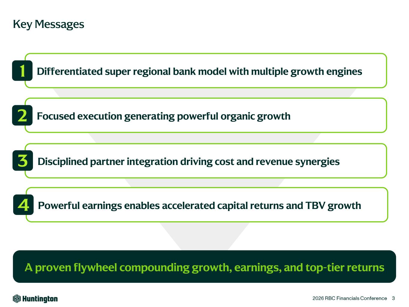 Abundant Green R: 126 G: 207 B: 28 Dark Teal R: 3 G: 79 B: 84 Pastel Teal R: 184 G: 239 B: 228 Pastel Magenta R: 248 G: 224 B: 229 White R: 255 G: 255 B: 255 Prosperous Sage R: 0 G: 45 B: 42 Primary Palette Off-White R: 245 G: 245 B: 245 Highlight Green R: 177 G: 238 B: 44 Legacy Green R: 45 G: 130 B: 42 Light Teal R: 121 G: 222 B: 226 Deep Sage R: 33 G: 72 B: 70 Highlight Teal R: 58 G: 204 B: 223 Charts/Graphs Palette Pastel Magenta R: 248 G: 224 B: 229 Dark Magenta R: 80 G: 16 B: 89 Highlight Magenta R: 193 G: 22 B: 216 Capstone Blue R: 4 G: 30 B: 66 Deep Magenta R: 144 G: 5 B: 163 Second Palette 2026 RBC Financials Conference Disclaimer 2 Caution Regarding Forward -Looking Statements The information contained or incorporated by reference in this presentation contains certain forward - looking statements, includi ng, but not limited to, certain plans, expectations, goals, projections, and statements, which are not historical facts and are subject to numerous assumptions, risks, estimates, and un cer tainties that are beyond the control of Huntington. Statements that do not describe historical or current facts, including statements about beliefs and expectations, are forward - looking statements. Forward - looking statements may be identified by words such as expect, anticipate, continue, believe, intend, estimate, plan, trend, objective, target, goal, or similar expressions, or future or conditional verbs such as will, may, might, should, would, could, or similar variations. The forward - looking statements are intended to be subject to the safe h arbor provided by Section 27A of the Securities Act of 1933, Section 21E of the Securities Exchange Act of 1934, and the Private Securities Litigation Reform Act of 1995. While there is no assurance that any list of risks and uncertainties or risk factors is complete, below are certain factors w hic h could cause actual results to differ materially from those contained or implied in the forward - looking statements or historical performance: changes in general economic, political, regula tory, or industry conditions; deterioration in business and economic conditions, including persistent inflation, supply chain issues or labor shortages; instability in global econom ic conditions and geopolitical matters, as well as volatility in financial markets; changes in U.S. trade policies, including the imposition of tariffs and retaliatory tariffs; the impact of pa ndemics and other catastrophic events or disasters on the global economy and financial market conditions and our business, results of operations, and financial condition; the impacts related to or resulting from bank failures and other volatility, including potential increased regulatory requirements and costs, such as Federal Deposit Insurance Corporation ("FDIC") speci al assessments, long -term debt requirements and heightened capital requirements; potential impacts to macroeconomic conditions, which could affect the ability of depository ins titutions, including us, to attract and retain depositors and to borrow or raise capital; unexpected outflows of deposits which may require us to sell investment securities at a loss; ch anging interest rates which could negatively impact the value of our portfolio of investment securities; the loss of value of our investment portfolio which could negatively impact mar ket perceptions of us and could lead to deposit withdrawals; market perceptions of us and banks generally, including from the effects of social media; cybersecurity risks; u nce rtainty in U.S. fiscal and monetary policy, including the interest rate policies of the Board of Governors of the Federal Reserve System ("Federal Reserve"); volatility and disruption s in global capital, foreign exchange and credit markets; movements in interest rates; competitive pressures on product pricing and services; success, impact and timing of our busines s s trategies, including market acceptance of any new products or services including those implementing our "Fair Play" banking philosophy; introduction of new competitive product s, such as stablecoins, and new competitors, such as financial technology companies and other "nontraditional" bank competitors; changes in policies and standards for regulatory review of bank mergers; the nature, extent, timing and results of governmental actions, examinations, reviews, reforms, regulations and interpretations, including those related to the Dodd -Frank Wall Street Reform and Consumer Protection Act and the Basel III regulatory capital reforms, as well as those involving the Securities and Exchange Commissio n ("SEC"), the Office of the Comptroller of the Currency, the Federal Reserve, the FDIC, the Consumer Financial Protection Bureau, and state - level regulators; the possibility that the antici pated benefits of recent or proposed acquisitions are not realized when expected or at all, including as a result of the impact of, or problems arising from, the integration of the co mpa nies or as a result of the strength of the economy and competitive factors in the areas where the companies do business; and other factors that may affect the future results of Hun tington. All forward - looking statements are expressly qualified in their entirety by the cautionary statements set forth above. Forward - looking statements speak only as of the date they are made and are based on information available at that time. Huntington does not assume any obligation to update forward - looking stateme nts to reflect actual results, new information or future events, changes in assumptions or changes in circumstances or other factors affecting forward - looking statements that occur afte r the date the forward - looking statements were made or to reflect the occurrence of unanticipated events except as required by federal securities laws. If Huntington updates one or more forward - looking statements, no inference should be drawn that Huntington will make additional updates w