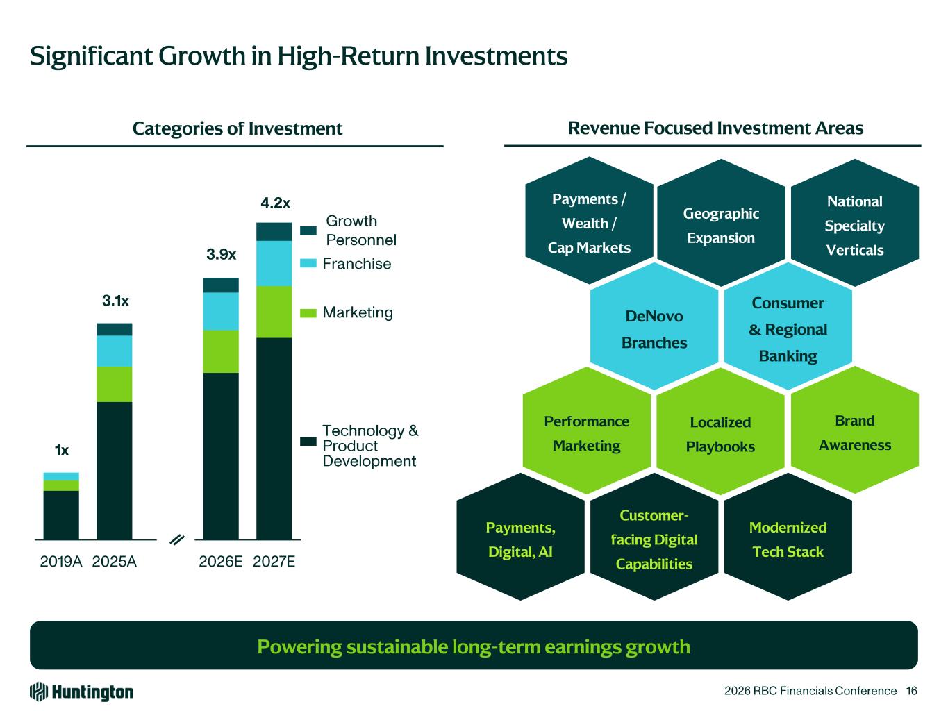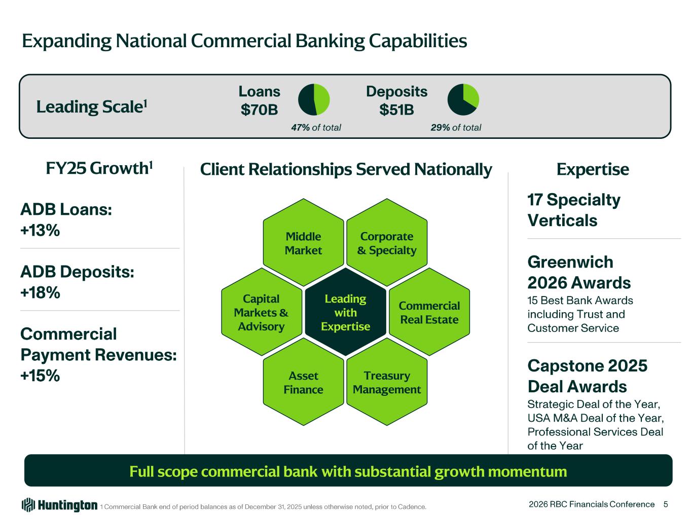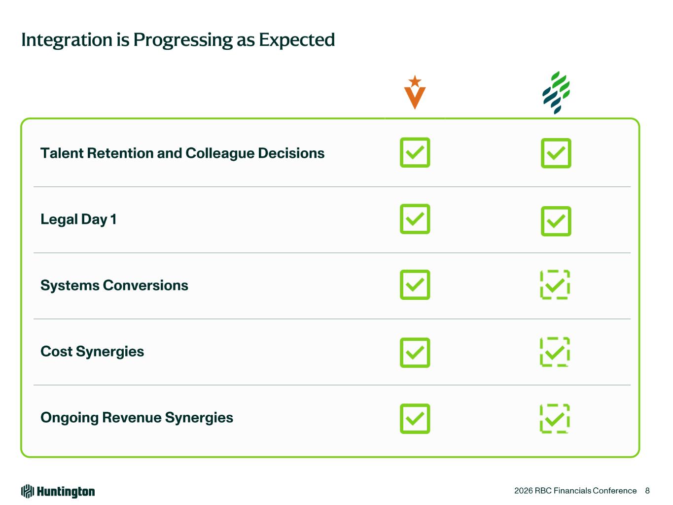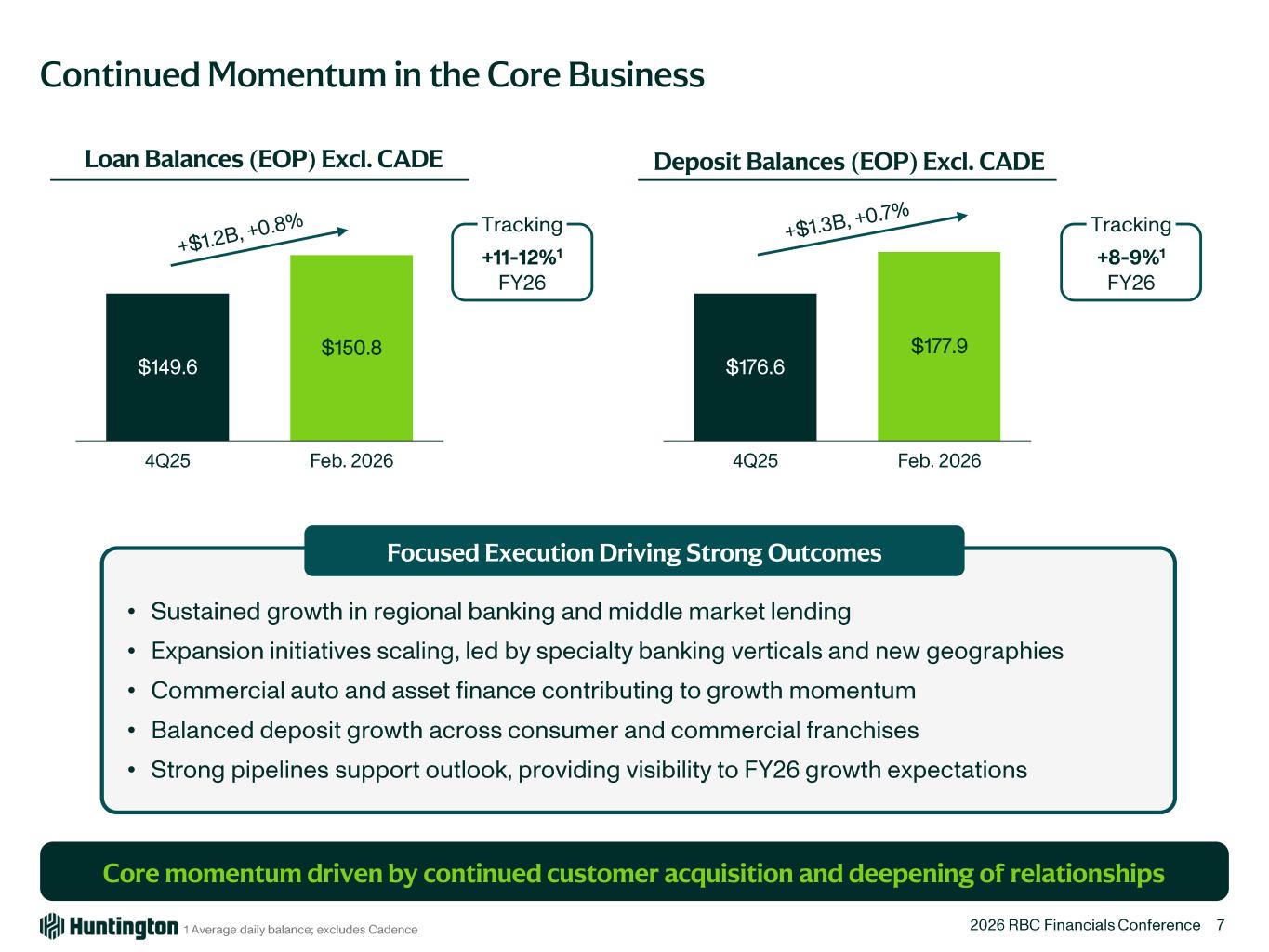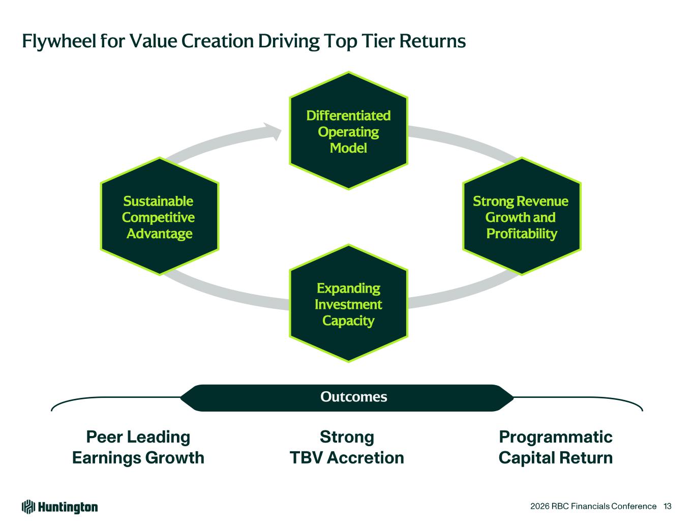 Abundant Green R: 126 G: 207 B: 28 Dark Teal R: 3 G: 79 B: 84 Pastel Teal R: 184 G: 239 B: 228 Pastel Magenta R: 248 G: 224 B: 229 White R: 255 G: 255 B: 255 Prosperous Sage R: 0 G: 45 B: 42 Primary Palette Off-White R: 245 G: 245 B: 245 Highlight Green R: 177 G: 238 B: 44 Legacy Green R: 45 G: 130 B: 42 Light Teal R: 121 G: 222 B: 226 Deep Sage R: 33 G: 72 B: 70 Highlight Teal R: 58 G: 204 B: 223 Charts/Graphs Palette Pastel Magenta R: 248 G: 224 B: 229 Dark Magenta R: 80 G: 16 B: 89 Highlight Magenta R: 193 G: 22 B: 216 Capstone Blue R: 4 G: 30 B: 66 Deep Magenta R: 144 G: 5 B: 163 Second Palette March 11, 2026 2026 RBC Global Financial Institutions Conference Welcome. The Huntington National Bank is Member FDIC. Huntington, Huntington Bank, and the Huntington Brandmark are service marks of Huntington Bancshares Incorporated. ©2026 Huntington Bancshares Incorporated.