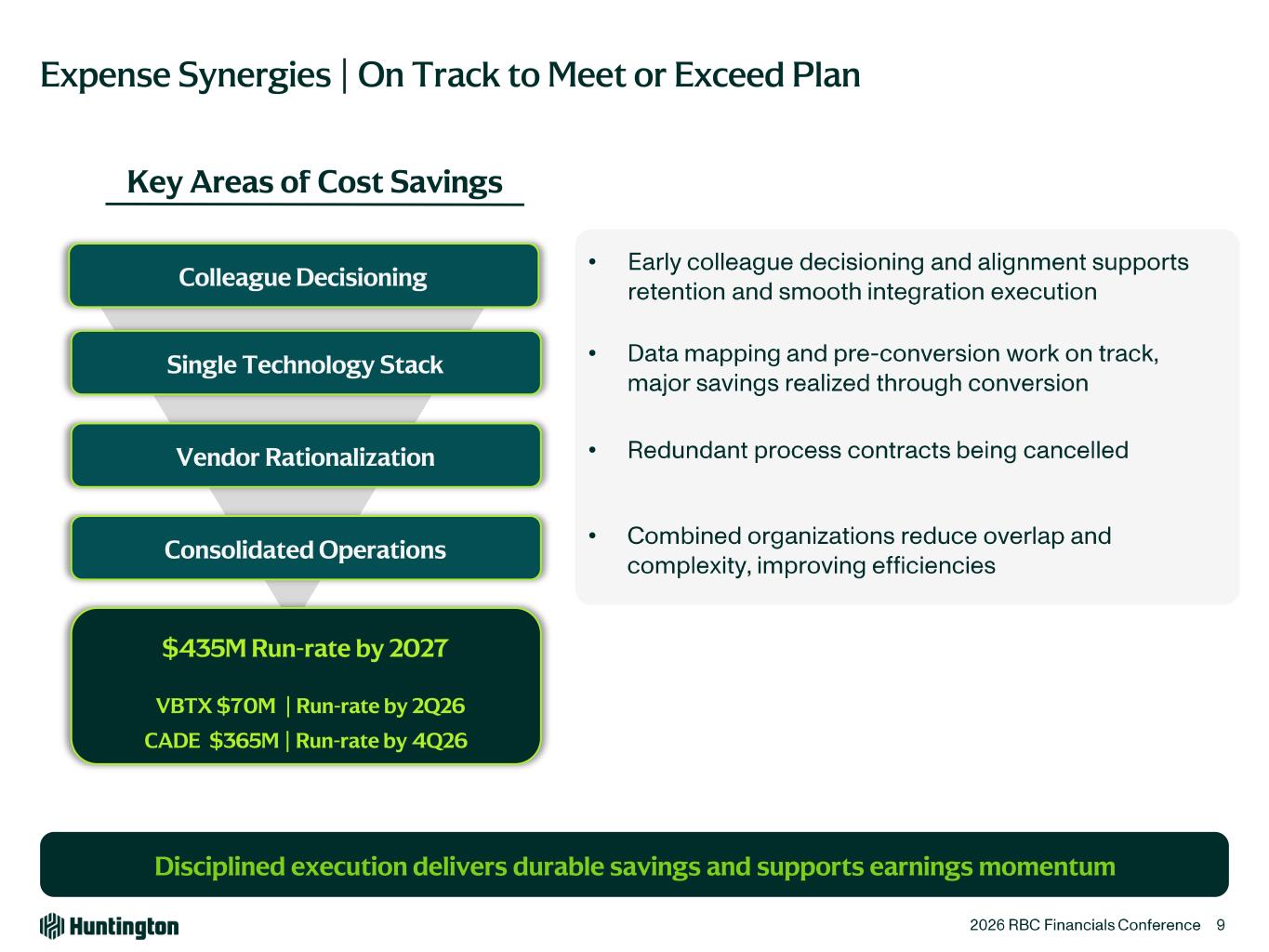 Abundant Green R: 126 G: 207 B: 28 Dark Teal R: 3 G: 79 B: 84 Pastel Teal R: 184 G: 239 B: 228 Pastel Magenta R: 248 G: 224 B: 229 White R: 255 G: 255 B: 255 Prosperous Sage R: 0 G: 45 B: 42 Primary Palette Off-White R: 245 G: 245 B: 245 Highlight Green R: 177 G: 238 B: 44 Legacy Green R: 45 G: 130 B: 42 Light Teal R: 121 G: 222 B: 226 Deep Sage R: 33 G: 72 B: 70 Highlight Teal R: 58 G: 204 B: 223 Charts/Graphs Palette Pastel Magenta R: 248 G: 224 B: 229 Dark Magenta R: 80 G: 16 B: 89 Highlight Magenta R: 193 G: 22 B: 216 Capstone Blue R: 4 G: 30 B: 66 Deep Magenta R: 144 G: 5 B: 163 Second Palette 2026 RBC Financials Conference Expense Synergies | On Track to Meet or Exceed Plan 9 Disciplined execution delivers durable savings and supports earnings momentum Single Technology Stack Vendor Rationalization Consolidated Operations Key Areas of Cost Savings Colleague Decisioning $435M Run-rate by 2027 CADE $365M | Run-rate by 4Q26 VBTX $70M | Run-rate by 2Q26 • Data mapping and pre -conversion work on track, major savings realized through conversion • Early colleague decisioning and alignment supports retention and smooth integration execution • Redundant process contracts being cancelled • Combined organizations reduce overlap and complexity, improving efficiencies