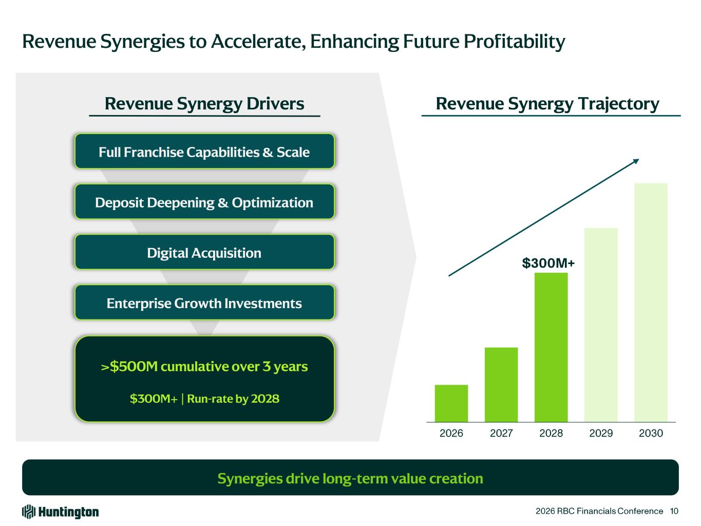 Abundant Green R: 126 G: 207 B: 28 Dark Teal R: 3 G: 79 B: 84 Pastel Teal R: 184 G: 239 B: 228 Pastel Magenta R: 248 G: 224 B: 229 White R: 255 G: 255 B: 255 Prosperous Sage R: 0 G: 45 B: 42 Primary Palette Off-White R: 245 G: 245 B: 245 Highlight Green R: 177 G: 238 B: 44 Legacy Green R: 45 G: 130 B: 42 Light Teal R: 121 G: 222 B: 226 Deep Sage R: 33 G: 72 B: 70 Highlight Teal R: 58 G: 204 B: 223 Charts/Graphs Palette Pastel Magenta R: 248 G: 224 B: 229 Dark Magenta R: 80 G: 16 B: 89 Highlight Magenta R: 193 G: 22 B: 216 Capstone Blue R: 4 G: 30 B: 66 Deep Magenta R: 144 G: 5 B: 163 Second Palette 2026 RBC Financials Conference Revenue Synergies to Accelerate, Enhancing Future Profitability 10 Synergies drive long-term value creation Revenue Synergy Trajectory $300M+ 2026 2027 2028 2029 2030 Revenue Synergy Drivers Full Franchise Capabilities & Scale Deposit Deepening & Optimization Digital Acquisition Enterprise Growth Investments >$500M cumulative over 3 years $300M+ | Run-rate by 2028