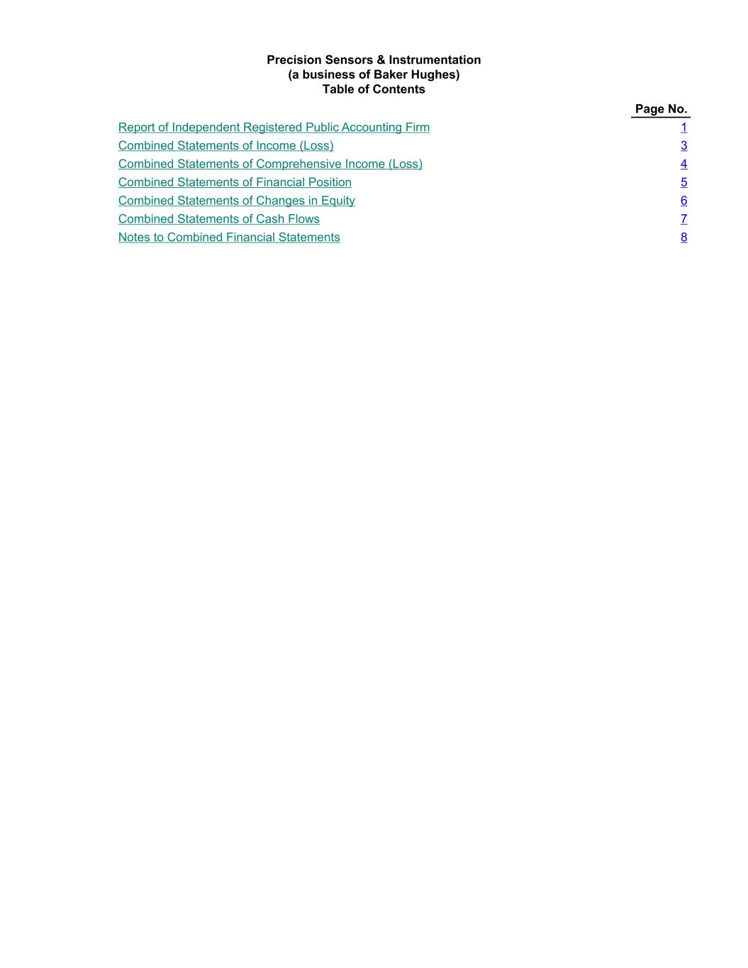 Precision Sensors & Instrumentation (a business of Baker Hughes) Table of Contents Page No. Report of Independent Registered Public Accounting Firm 1 Combined Statements of Income (Loss) 3 Combined Statements of Comprehensive Income (Loss) 4 Combined Statements of Financial Position 5 Combined Statements of Changes in Equity 6 Combined Statements of Cash Flows 7 Notes to Combined Financial Statements 8