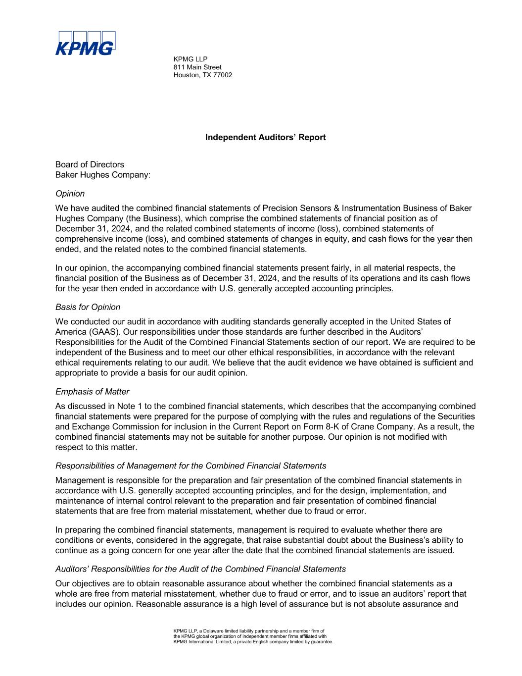 KPMG LLP 811 Main Street Houston, TX 77002 KPMG LLP, a Delaware limited liability partnership and a member firm of the KPMG global organization of independent member firms affiliated with KPMG International Limited, a private English company limited by guarantee. Independent Auditors’ Report Board of Directors Baker Hughes Company: Opinion We have audited the combined financial statements of Precision Sensors & Instrumentation Business of Baker Hughes Company (the Business), which comprise the combined statements of financial position as of December 31, 2024, and the related combined statements of income (loss), combined statements of comprehensive income (loss), and combined statements of changes in equity, and cash flows for the year then ended, and the related notes to the combined financial statements. In our opinion, the accompanying combined financial statements present fairly, in all material respects, the financial position of the Business as of December 31, 2024, and the results of its operations and its cash flows for the year then ended in accordance with U.S. generally accepted accounting principles. Basis for Opinion We conducted our audit in accordance with auditing standards generally accepted in the United States of America (GAAS). Our responsibilities under those standards are further described in the Auditors’ Responsibilities for the Audit of the Combined Financial Statements section of our report. We are required to be independent of the Business and to meet our other ethical responsibilities, in accordance with the relevant ethical requirements relating to our audit. We believe that the audit evidence we have obtained is sufficient and appropriate to provide a basis for our audit opinion. Emphasis of Matter As discussed in Note 1 to the combined financial statements, which describes that the accompanying combined financial statements were prepared for the purpose of complying with the rules and regulations of the Securities and Exchange Commission for inclusion in the Current Report on Form 8-K of Crane Company. As a result, the combined financial statements may not be suitable for another purpose. Our opinion is not modified with respect to this matter. Responsibilities of Management for the Combined Financial Statements Management is responsible for the preparation and fair presentation of the combined financial statements in accordance with U.S. generally accepted accounting principles, and for the design, implementation, and maintenance of internal control relevant to the preparation and fair presentation of combined financial statements that are free from material misstatement, whether due to fraud or error. In preparing the combined financial statements, management is required to evaluate whether there are conditions or events, considered in the aggregate, that raise substantial doubt about the Business’s ability to continue as a going concern for one year after the date that the combined financial statements are issued. Auditors’ Responsibilities for the Audit of the Combined Financial Statements Our objectives are to obtain reasonable assurance about whether the combined financial statements as a whole are free from material misstatement, whether due to fraud or error, and to issue an auditors’ report that includes our opinion. Reasonable assurance is a high level of assurance but is not absolute assurance and