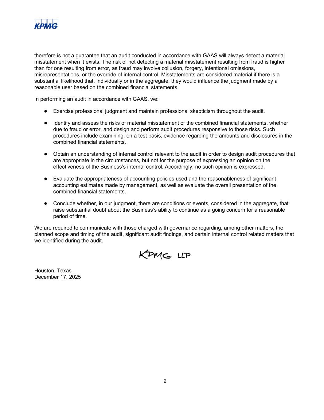 2 therefore is not a guarantee that an audit conducted in accordance with GAAS will always detect a material misstatement when it exists. The risk of not detecting a material misstatement resulting from fraud is higher than for one resulting from error, as fraud may involve collusion, forgery, intentional omissions, misrepresentations, or the override of internal control. Misstatements are considered material if there is a substantial likelihood that, individually or in the aggregate, they would influence the judgment made by a reasonable user based on the combined financial statements. In performing an audit in accordance with GAAS, we: ● Exercise professional judgment and maintain professional skepticism throughout the audit. ● Identify and assess the risks of material misstatement of the combined financial statements, whether due to fraud or error, and design and perform audit procedures responsive to those risks. Such procedures include examining, on a test basis, evidence regarding the amounts and disclosures in the combined financial statements. ● Obtain an understanding of internal control relevant to the audit in order to design audit procedures that are appropriate in the circumstances, but not for the purpose of expressing an opinion on the effectiveness of the Business’s internal control. Accordingly, no such opinion is expressed. ● Evaluate the appropriateness of accounting policies used and the reasonableness of significant accounting estimates made by management, as well as evaluate the overall presentation of the combined financial statements. ● Conclude whether, in our judgment, there are conditions or events, considered in the aggregate, that raise substantial doubt about the Business’s ability to continue as a going concern for a reasonable period of time. We are required to communicate with those charged with governance regarding, among other matters, the planned scope and timing of the audit, significant audit findings, and certain internal control related matters that we identified during the audit. Houston, Texas December 17, 2025