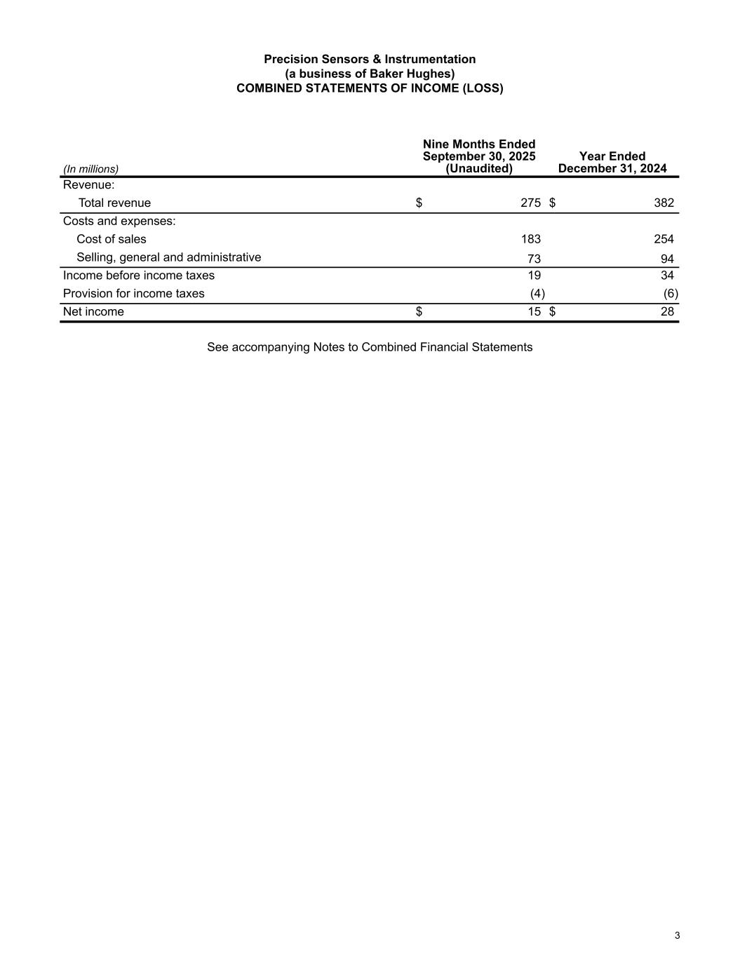 Precision Sensors & Instrumentation (a business of Baker Hughes) COMBINED STATEMENTS OF INCOME (LOSS) (In millions) Nine Months Ended September 30, 2025 (Unaudited) Year Ended December 31, 2024 Revenue: Total revenue $ 275 $ 382 Costs and expenses: Cost of sales 183 254 Selling, general and administrative 73 94 Income before income taxes 19 34 Provision for income taxes (4) (6) Net income $ 15 $ 28 See accompanying Notes to Combined Financial Statements 3