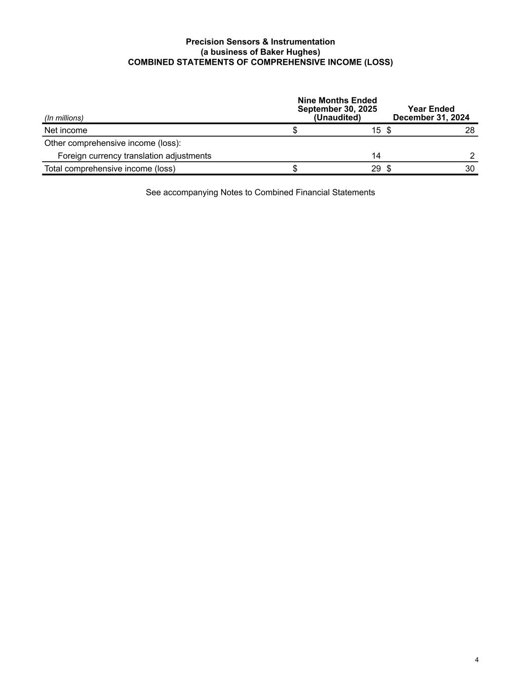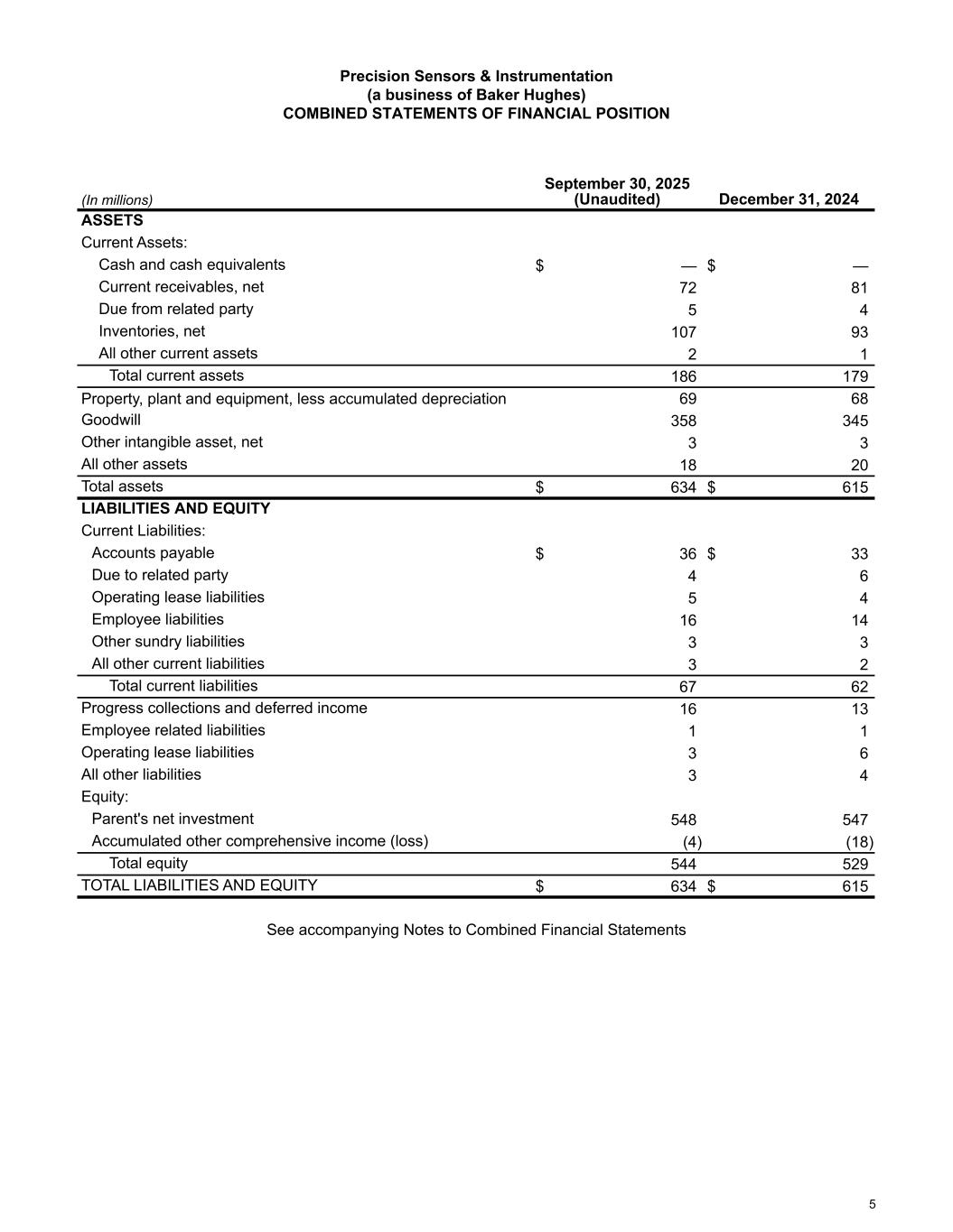 Precision Sensors & Instrumentation (a business of Baker Hughes) COMBINED STATEMENTS OF COMPREHENSIVE INCOME (LOSS) (In millions) Nine Months Ended September 30, 2025 (Unaudited) Year Ended December 31, 2024 Net income $ 15 $ 28 Other comprehensive income (loss): Foreign currency translation adjustments 14 2 Total comprehensive income (loss) $ 29 $ 30 See accompanying Notes to Combined Financial Statements 4