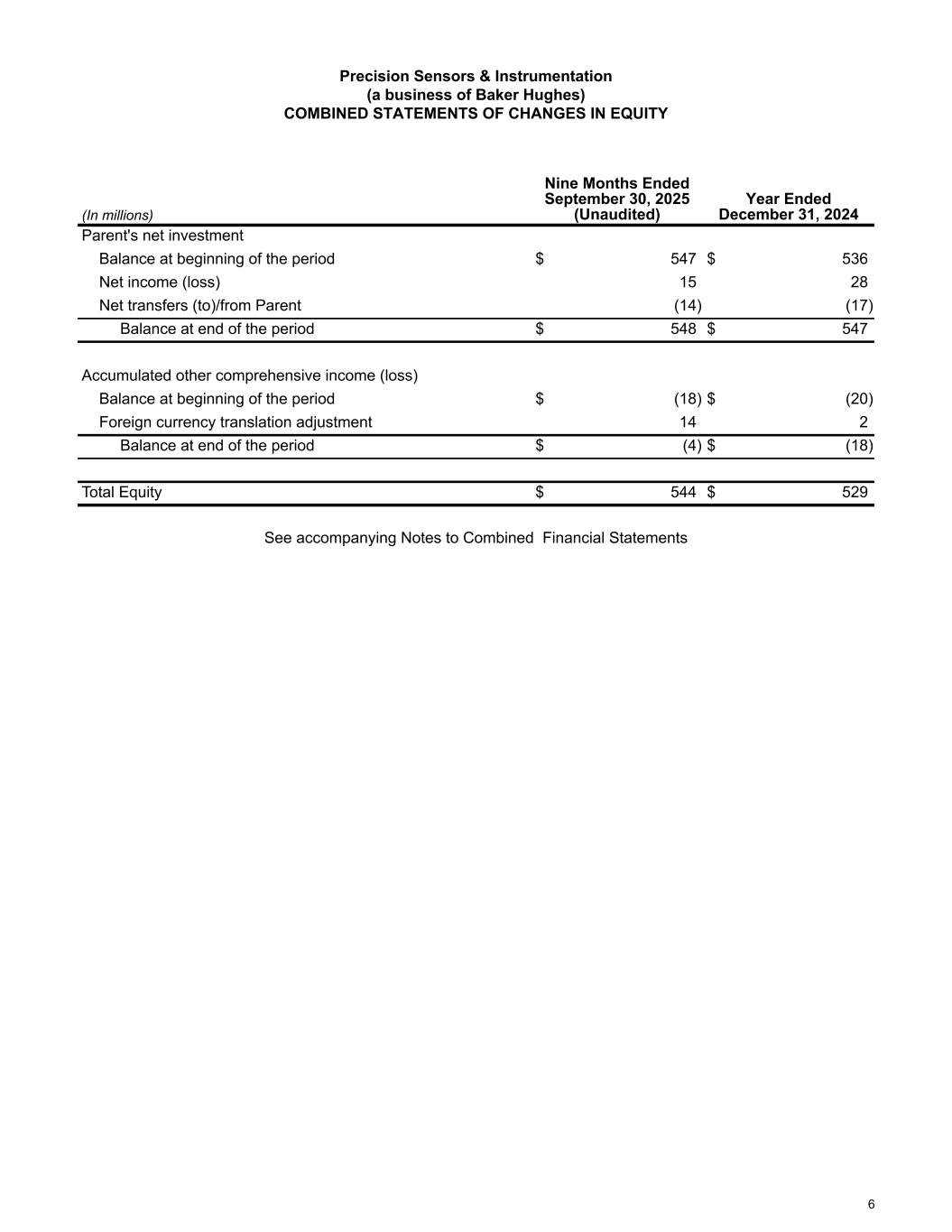 Precision Sensors & Instrumentation (a business of Baker Hughes) COMBINED STATEMENTS OF CHANGES IN EQUITY (In millions) Nine Months Ended September 30, 2025 (Unaudited) Year Ended December 31, 2024 Parent's net investment Balance at beginning of the period $ 547 $ 536 Net income (loss) 15 28 Net transfers (to)/from Parent (14) (17) Balance at end of the period $ 548 $ 547 Accumulated other comprehensive income (loss) Balance at beginning of the period $ (18) $ (20) Foreign currency translation adjustment 14 2 Balance at end of the period $ (4) $ (18) Total Equity $ 544 $ 529 See accompanying Notes to Combined Financial Statements 6