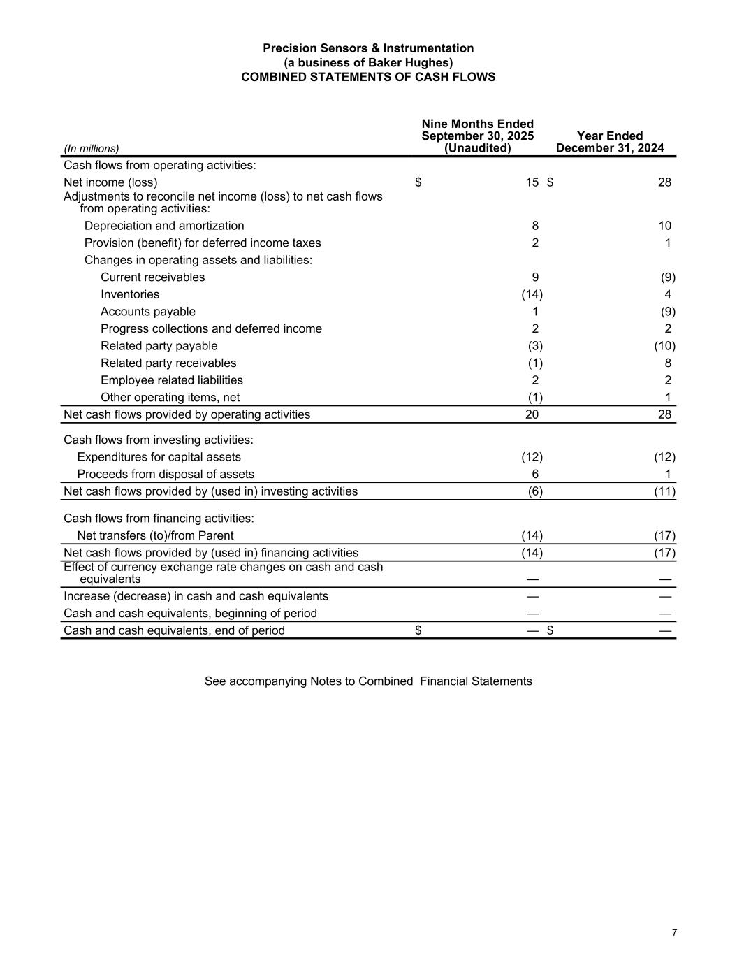 Precision Sensors & Instrumentation (a business of Baker Hughes) COMBINED STATEMENTS OF CASH FLOWS (In millions) Nine Months Ended September 30, 2025 (Unaudited) Year Ended December 31, 2024 Cash flows from operating activities: Net income (loss) $ 15 $ 28 Adjustments to reconcile net income (loss) to net cash flows from operating activities: Depreciation and amortization 8 10 Provision (benefit) for deferred income taxes 2 1 Changes in operating assets and liabilities: Current receivables 9 (9) Inventories (14) 4 Accounts payable 1 (9) Progress collections and deferred income 2 2 Related party payable (3) (10) Related party receivables (1) 8 Employee related liabilities 2 2 Other operating items, net (1) 1 Net cash flows provided by operating activities 20 28 Cash flows from investing activities: Expenditures for capital assets (12) (12) Proceeds from disposal of assets 6 1 Net cash flows provided by (used in) investing activities (6) (11) Cash flows from financing activities: Net transfers (to)/from Parent (14) (17) Net cash flows provided by (used in) financing activities (14) (17) Effect of currency exchange rate changes on cash and cash equivalents — — Increase (decrease) in cash and cash equivalents — — Cash and cash equivalents, beginning of period — — Cash and cash equivalents, end of period $ — $ — See accompanying Notes to Combined Financial Statements 7