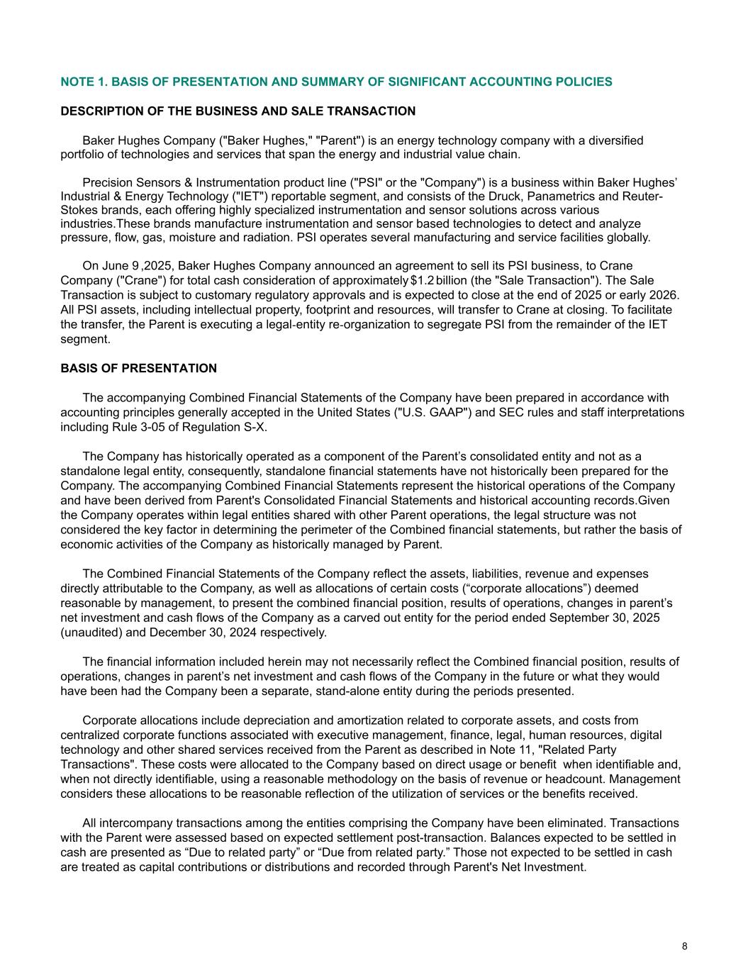 NOTE 1. BASIS OF PRESENTATION AND SUMMARY OF SIGNIFICANT ACCOUNTING POLICIES DESCRIPTION OF THE BUSINESS AND SALE TRANSACTION Baker Hughes Company ("Baker Hughes," "Parent") is an energy technology company with a diversified portfolio of technologies and services that span the energy and industrial value chain. Precision Sensors & Instrumentation product line ("PSI" or the "Company") is a business within Baker Hughes’ Industrial & Energy Technology ("IET") reportable segment, and consists of the Druck, Panametrics and Reuter- Stokes brands, each offering highly specialized instrumentation and sensor solutions across various industries.These brands manufacture instrumentation and sensor based technologies to detect and analyze pressure, flow, gas, moisture and radiation. PSI operates several manufacturing and service facilities globally. On June 9 ,2025, Baker Hughes Company announced an agreement to sell its PSI business, to Crane Company ("Crane") for total cash consideration of approximately $1.2 billion (the "Sale Transaction"). The Sale Transaction is subject to customary regulatory approvals and is expected to close at the end of 2025 or early 2026. All PSI assets, including intellectual property, footprint and resources, will transfer to Crane at closing. To facilitate the transfer, the Parent is executing a legal-entity re-organization to segregate PSI from the remainder of the IET segment. BASIS OF PRESENTATION The accompanying Combined Financial Statements of the Company have been prepared in accordance with accounting principles generally accepted in the United States ("U.S. GAAP") and SEC rules and staff interpretations including Rule 3-05 of Regulation S-X. The Company has historically operated as a component of the Parent’s consolidated entity and not as a standalone legal entity, consequently, standalone financial statements have not historically been prepared for the Company. The accompanying Combined Financial Statements represent the historical operations of the Company and have been derived from Parent's Consolidated Financial Statements and historical accounting records.Given the Company operates within legal entities shared with other Parent operations, the legal structure was not considered the key factor in determining the perimeter of the Combined financial statements, but rather the basis of economic activities of the Company as historically managed by Parent. The Combined Financial Statements of the Company reflect the assets, liabilities, revenue and expenses directly attributable to the Company, as well as allocations of certain costs (“corporate allocations”) deemed reasonable by management, to present the combined financial position, results of operations, changes in parent’s net investment and cash flows of the Company as a carved out entity for the period ended September 30, 2025 (unaudited) and December 30, 2024 respectively. The financial information included herein may not necessarily reflect the Combined financial position, results of operations, changes in parent’s net investment and cash flows of the Company in the future or what they would have been had the Company been a separate, stand-alone entity during the periods presented. Corporate allocations include depreciation and amortization related to corporate assets, and costs from centralized corporate functions associated with executive management, finance, legal, human resources, digital technology and other shared services received from the Parent as described in Note 11, "Related Party Transactions". These costs were allocated to the Company based on direct usage or benefit when identifiable and, when not directly identifiable, using a reasonable methodology on the basis of revenue or headcount. Management considers these allocations to be reasonable reflection of the utilization of services or the benefits received. All intercompany transactions among the entities comprising the Company have been eliminated. Transactions with the Parent were assessed based on expected settlement post-transaction. Balances expected to be settled in cash are presented as “Due to related party” or “Due from related party.” Those not expected to be settled in cash are treated as capital contributions or distributions and recorded through Parent's Net Investment. 8