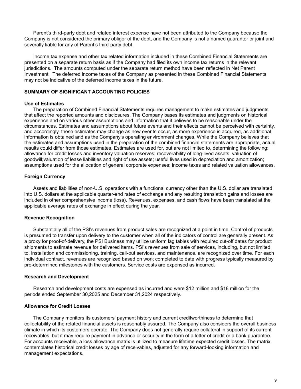 Parent’s third-party debt and related interest expense have not been attributed to the Company because the Company is not considered the primary obligor of the debt, and the Company is not a named guarantor or joint and severally liable for any of Parent’s third-party debt. Income tax expense and other tax related information included in these Combined Financial Statements are presented on a separate return basis as if the Company had filed its own income tax returns in the relevant jurisdictions. The amounts computed under the separate return method have been reflected in Net Parent Investment. The deferred income taxes of the Company as presented in these Combined Financial Statements may not be indicative of the deferred income taxes in the future. SUMMARY OF SIGNIFICANT ACCOUNTING POLICIES Use of Estimates The preparation of Combined Financial Statements requires management to make estimates and judgments that affect the reported amounts and disclosures. The Company bases its estimates and judgments on historical experience and on various other assumptions and information that it believes to be reasonable under the circumstances. Estimates and assumptions about future events and their effects cannot be perceived with certainty, and accordingly, these estimates may change as new events occur, as more experience is acquired, as additional information is obtained and as the Company's operating environment changes. While the Company believes that the estimates and assumptions used in the preparation of the combined financial statements are appropriate, actual results could differ from those estimates. Estimates are used for, but are not limited to, determining the following: allowance for credit losses and inventory valuation reserves; recoverability of long-lived assets; valuation of goodwill;valuation of lease liabilities and right of use assets; useful lives used in depreciation and amortization; assumptions used for the allocation of general corporate expenses; income taxes and related valuation allowances. Foreign Currency Assets and liabilities of non-U.S. operations with a functional currency other than the U.S. dollar are translated into U.S. dollars at the applicable quarter-end rates of exchange and any resulting translation gains and losses are included in other comprehensive income (loss). Revenues, expenses, and cash flows have been translated at the applicable average rates of exchange in effect during the year. Revenue Recognition Substantially all of the PSI's revenues from product sales are recognized at a point in time. Control of products is presumed to transfer upon delivery to the customer when all of the indicators of control are generally present. As a proxy for proof-of-delivery, the PSI Business may utilize uniform lag tables with required cut-off dates for product shipments to estimate revenue for delivered items. PSI's revenues from sale of services, including, but not limited to, installation and commissioning, training, call-out services, and maintenance, are recognized over time. For each individual contract, revenues are recognized based on work completed to date with progress typically measured by pre-determined milestones with the customers. Service costs are expensed as incurred. Research and Development Research and development costs are expensed as incurred and were $12 million and $18 million for the periods ended September 30,2025 and December 31,2024 respectively. Allowance for Credit Losses The Company monitors its customers' payment history and current creditworthiness to determine that collectability of the related financial assets is reasonably assured. The Company also considers the overall business climate in which its customers operate. The Company does not generally require collateral in support of its current receivables, but it may require payment in advance or security in the form of a letter of credit or a bank guarantee. For accounts receivable, a loss allowance matrix is utilized to measure lifetime expected credit losses. The matrix contemplates historical credit losses by age of receivables, adjusted for any forward-looking information and management expectations. 9