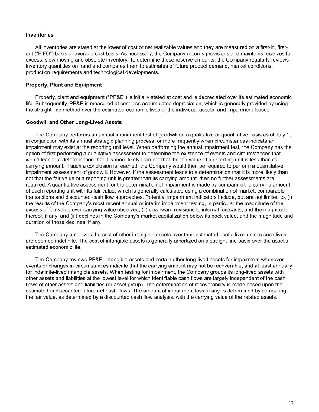 Inventories All inventories are stated at the lower of cost or net realizable values and they are measured on a first-in, first- out ("FIFO") basis or average cost basis. As necessary, the Company records provisions and maintains reserves for excess, slow moving and obsolete inventory. To determine these reserve amounts, the Company regularly reviews inventory quantities on hand and compares them to estimates of future product demand, market conditions, production requirements and technological developments. Property, Plant and Equipment Property, plant and equipment ("PP&E") is initially stated at cost and is depreciated over its estimated economic life. Subsequently, PP&E is measured at cost less accumulated depreciation, which is generally provided by using the straight-line method over the estimated economic lives of the individual assets, and impairment losses. Goodwill and Other Long-Lived Assets The Company performs an annual impairment test of goodwill on a qualitative or quantitative basis as of July 1, in conjunction with its annual strategic planning process, or more frequently when circumstances indicate an impairment may exist at the reporting unit level. When performing the annual impairment test, the Company has the option of first performing a qualitative assessment to determine the existence of events and circumstances that would lead to a determination that it is more likely than not that the fair value of a reporting unit is less than its carrying amount. If such a conclusion is reached, the Company would then be required to perform a quantitative impairment assessment of goodwill. However, if the assessment leads to a determination that it is more likely than not that the fair value of a reporting unit is greater than its carrying amount, then no further assessments are required. A quantitative assessment for the determination of impairment is made by comparing the carrying amount of each reporting unit with its fair value, which is generally calculated using a combination of market, comparable transactions and discounted cash flow approaches. Potential impairment indicators include, but are not limited to, (i) the results of the Company's most recent annual or interim impairment testing, in particular the magnitude of the excess of fair value over carrying value observed; (ii) downward revisions to internal forecasts, and the magnitude thereof, if any; and (iii) declines in the Company's market capitalization below its book value, and the magnitude and duration of those declines, if any. The Company amortizes the cost of other intangible assets over their estimated useful lives unless such lives are deemed indefinite. The cost of intangible assets is generally amortized on a straight-line basis over the asset's estimated economic life. The Company reviews PP&E, intangible assets and certain other long-lived assets for impairment whenever events or changes in circumstances indicate that the carrying amount may not be recoverable, and at least annually for indefinite-lived intangible assets. When testing for impairment, the Company groups its long-lived assets with other assets and liabilities at the lowest level for which identifiable cash flows are largely independent of the cash flows of other assets and liabilities (or asset group). The determination of recoverability is made based upon the estimated undiscounted future net cash flows. The amount of impairment loss, if any, is determined by comparing the fair value, as determined by a discounted cash flow analysis, with the carrying value of the related assets. 10