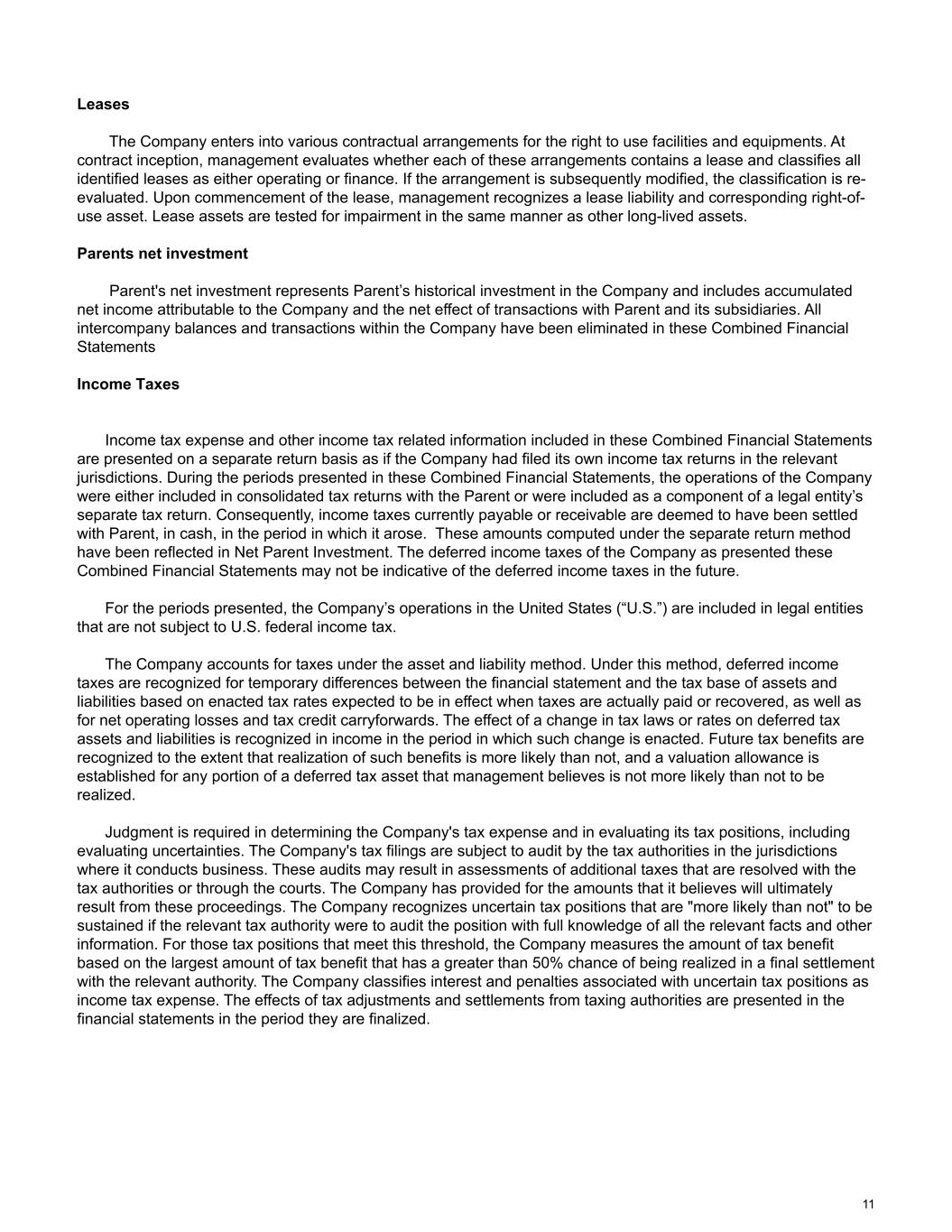 Leases The Company enters into various contractual arrangements for the right to use facilities and equipments. At contract inception, management evaluates whether each of these arrangements contains a lease and classifies all identified leases as either operating or finance. If the arrangement is subsequently modified, the classification is re- evaluated. Upon commencement of the lease, management recognizes a lease liability and corresponding right-of- use asset. Lease assets are tested for impairment in the same manner as other long-lived assets. Parents net investment Parent's net investment represents Parent’s historical investment in the Company and includes accumulated net income attributable to the Company and the net effect of transactions with Parent and its subsidiaries. All intercompany balances and transactions within the Company have been eliminated in these Combined Financial Statements Income Taxes Income tax expense and other income tax related information included in these Combined Financial Statements are presented on a separate return basis as if the Company had filed its own income tax returns in the relevant jurisdictions. During the periods presented in these Combined Financial Statements, the operations of the Company were either included in consolidated tax returns with the Parent or were included as a component of a legal entity’s separate tax return. Consequently, income taxes currently payable or receivable are deemed to have been settled with Parent, in cash, in the period in which it arose. These amounts computed under the separate return method have been reflected in Net Parent Investment. The deferred income taxes of the Company as presented these Combined Financial Statements may not be indicative of the deferred income taxes in the future. For the periods presented, the Company’s operations in the United States (“U.S.”) are included in legal entities that are not subject to U.S. federal income tax. The Company accounts for taxes under the asset and liability method. Under this method, deferred income taxes are recognized for temporary differences between the financial statement and the tax base of assets and liabilities based on enacted tax rates expected to be in effect when taxes are actually paid or recovered, as well as for net operating losses and tax credit carryforwards. The effect of a change in tax laws or rates on deferred tax assets and liabilities is recognized in income in the period in which such change is enacted. Future tax benefits are recognized to the extent that realization of such benefits is more likely than not, and a valuation allowance is established for any portion of a deferred tax asset that management believes is not more likely than not to be realized. Judgment is required in determining the Company's tax expense and in evaluating its tax positions, including evaluating uncertainties. The Company's tax filings are subject to audit by the tax authorities in the jurisdictions where it conducts business. These audits may result in assessments of additional taxes that are resolved with the tax authorities or through the courts. The Company has provided for the amounts that it believes will ultimately result from these proceedings. The Company recognizes uncertain tax positions that are "more likely than not" to be sustained if the relevant tax authority were to audit the position with full knowledge of all the relevant facts and other information. For those tax positions that meet this threshold, the Company measures the amount of tax benefit based on the largest amount of tax benefit that has a greater than 50% chance of being realized in a final settlement with the relevant authority. The Company classifies interest and penalties associated with uncertain tax positions as income tax expense. The effects of tax adjustments and settlements from taxing authorities are presented in the financial statements in the period they are finalized. 11