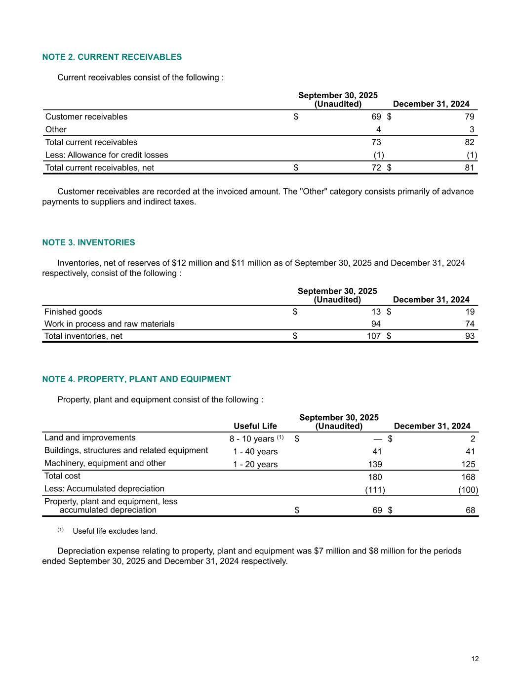 NOTE 2. CURRENT RECEIVABLES Current receivables consist of the following : September 30, 2025 (Unaudited) December 31, 2024 Customer receivables $ 69 $ 79 Other 4 3 Total current receivables 73 82 Less: Allowance for credit losses (1) (1) Total current receivables, net $ 72 $ 81 Customer receivables are recorded at the invoiced amount. The "Other" category consists primarily of advance payments to suppliers and indirect taxes. NOTE 3. INVENTORIES Inventories, net of reserves of $12 million and $11 million as of September 30, 2025 and December 31, 2024 respectively, consist of the following : September 30, 2025 (Unaudited) December 31, 2024 Finished goods $ 13 $ 19 Work in process and raw materials 94 74 Total inventories, net $ 107 $ 93 NOTE 4. PROPERTY, PLANT AND EQUIPMENT Property, plant and equipment consist of the following : Useful Life September 30, 2025 (Unaudited) December 31, 2024 Land and improvements 8 - 10 years (1) $ — $ 2 Buildings, structures and related equipment 1 - 40 years 41 41 Machinery, equipment and other 1 - 20 years 139 125 Total cost 180 168 Less: Accumulated depreciation (111) (100) Property, plant and equipment, less accumulated depreciation $ 69 $ 68 (1) Useful life excludes land. Depreciation expense relating to property, plant and equipment was $7 million and $8 million for the periods ended September 30, 2025 and December 31, 2024 respectively. 12