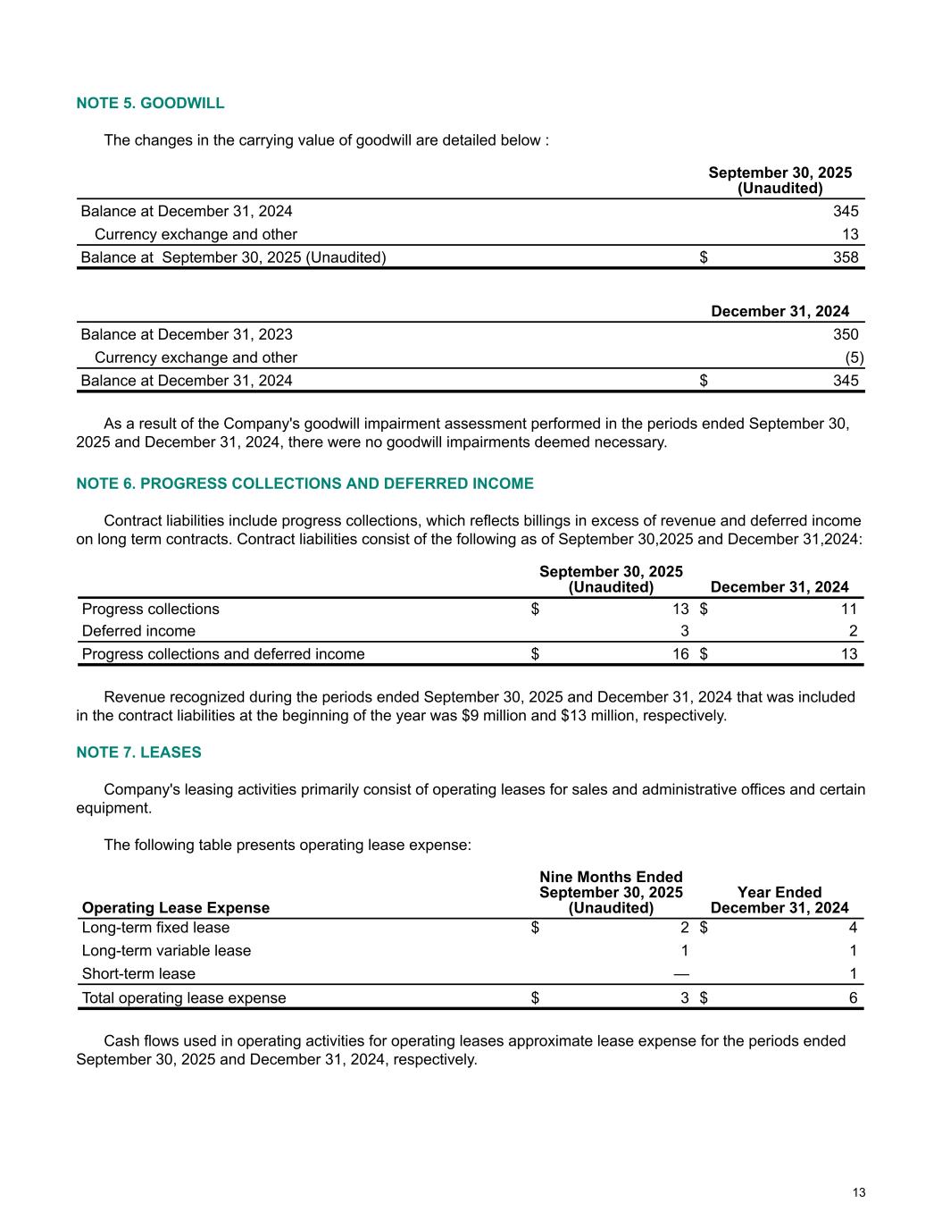 NOTE 5. GOODWILL The changes in the carrying value of goodwill are detailed below : September 30, 2025 (Unaudited) Balance at December 31, 2024 345 Currency exchange and other 13 Balance at September 30, 2025 (Unaudited) $ 358 December 31, 2024 Balance at December 31, 2023 350 Currency exchange and other (5) Balance at December 31, 2024 $ 345 As a result of the Company's goodwill impairment assessment performed in the periods ended September 30, 2025 and December 31, 2024, there were no goodwill impairments deemed necessary. NOTE 6. PROGRESS COLLECTIONS AND DEFERRED INCOME Contract liabilities include progress collections, which reflects billings in excess of revenue and deferred income on long term contracts. Contract liabilities consist of the following as of September 30,2025 and December 31,2024: September 30, 2025 (Unaudited) December 31, 2024 Progress collections $ 13 $ 11 Deferred income 3 2 Progress collections and deferred income $ 16 $ 13 Revenue recognized during the periods ended September 30, 2025 and December 31, 2024 that was included in the contract liabilities at the beginning of the year was $9 million and $13 million, respectively. NOTE 7. LEASES Company's leasing activities primarily consist of operating leases for sales and administrative offices and certain equipment. The following table presents operating lease expense: Operating Lease Expense Nine Months Ended September 30, 2025 (Unaudited) Year Ended December 31, 2024 Long-term fixed lease $ 2 $ 4 Long-term variable lease 1 1 Short-term lease — 1 Total operating lease expense $ 3 $ 6 Cash flows used in operating activities for operating leases approximate lease expense for the periods ended September 30, 2025 and December 31, 2024, respectively. 13