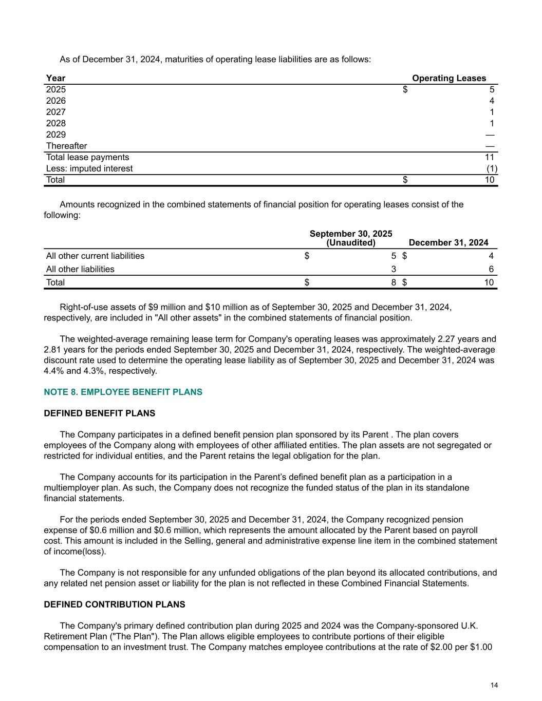 As of December 31, 2024, maturities of operating lease liabilities are as follows: Year Operating Leases 2025 $ 5 2026 4 2027 1 2028 1 2029 — Thereafter — Total lease payments 11 Less: imputed interest (1) Total $ 10 Amounts recognized in the combined statements of financial position for operating leases consist of the following: September 30, 2025 (Unaudited) December 31, 2024 All other current liabilities $ 5 $ 4 All other liabilities 3 6 Total $ 8 $ 10 Right-of-use assets of $9 million and $10 million as of September 30, 2025 and December 31, 2024, respectively, are included in "All other assets" in the combined statements of financial position. The weighted-average remaining lease term for Company's operating leases was approximately 2.27 years and 2.81 years for the periods ended September 30, 2025 and December 31, 2024, respectively. The weighted-average discount rate used to determine the operating lease liability as of September 30, 2025 and December 31, 2024 was 4.4% and 4.3%, respectively. NOTE 8. EMPLOYEE BENEFIT PLANS DEFINED BENEFIT PLANS The Company participates in a defined benefit pension plan sponsored by its Parent . The plan covers employees of the Company along with employees of other affiliated entities. The plan assets are not segregated or restricted for individual entities, and the Parent retains the legal obligation for the plan. The Company accounts for its participation in the Parent’s defined benefit plan as a participation in a multiemployer plan. As such, the Company does not recognize the funded status of the plan in its standalone financial statements. For the periods ended September 30, 2025 and December 31, 2024, the Company recognized pension expense of $0.6 million and $0.6 million, which represents the amount allocated by the Parent based on payroll cost. This amount is included in the Selling, general and administrative expense line item in the combined statement of income(loss). The Company is not responsible for any unfunded obligations of the plan beyond its allocated contributions, and any related net pension asset or liability for the plan is not reflected in these Combined Financial Statements. DEFINED CONTRIBUTION PLANS The Company's primary defined contribution plan during 2025 and 2024 was the Company-sponsored U.K. Retirement Plan ("The Plan"). The Plan allows eligible employees to contribute portions of their eligible compensation to an investment trust. The Company matches employee contributions at the rate of $2.00 per $1.00 14
