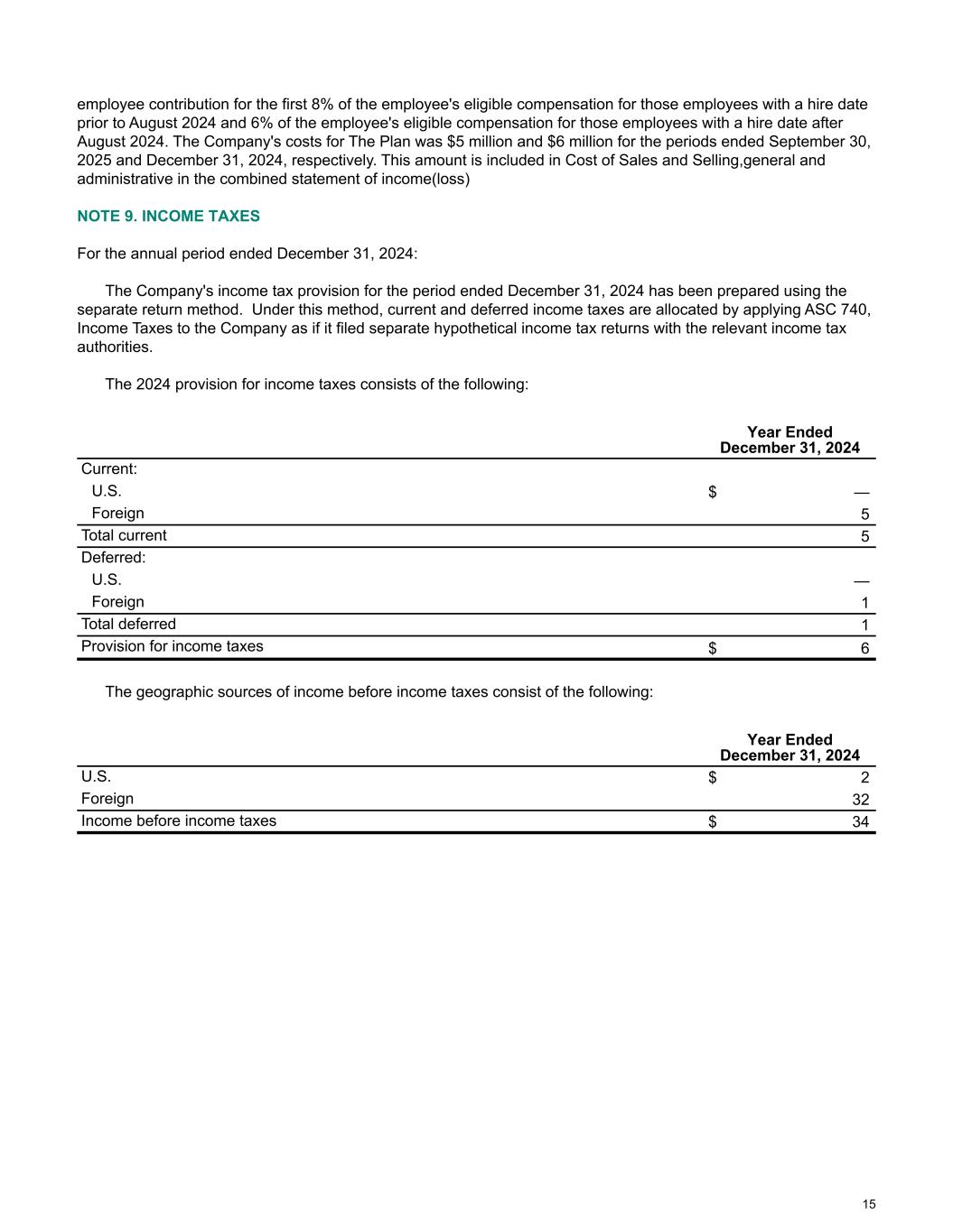 employee contribution for the first 8% of the employee's eligible compensation for those employees with a hire date prior to August 2024 and 6% of the employee's eligible compensation for those employees with a hire date after August 2024. The Company's costs for The Plan was $5 million and $6 million for the periods ended September 30, 2025 and December 31, 2024, respectively. This amount is included in Cost of Sales and Selling,general and administrative in the combined statement of income(loss) NOTE 9. INCOME TAXES For the annual period ended December 31, 2024: The Company's income tax provision for the period ended December 31, 2024 has been prepared using the separate return method. Under this method, current and deferred income taxes are allocated by applying ASC 740, Income Taxes to the Company as if it filed separate hypothetical income tax returns with the relevant income tax authorities. The 2024 provision for income taxes consists of the following: Year Ended December 31, 2024 Current: U.S. $ — Foreign 5 Total current 5 Deferred: U.S. — Foreign 1 Total deferred 1 Provision for income taxes $ 6 The geographic sources of income before income taxes consist of the following: Year Ended December 31, 2024 U.S. $ 2 Foreign 32 Income before income taxes $ 34 15