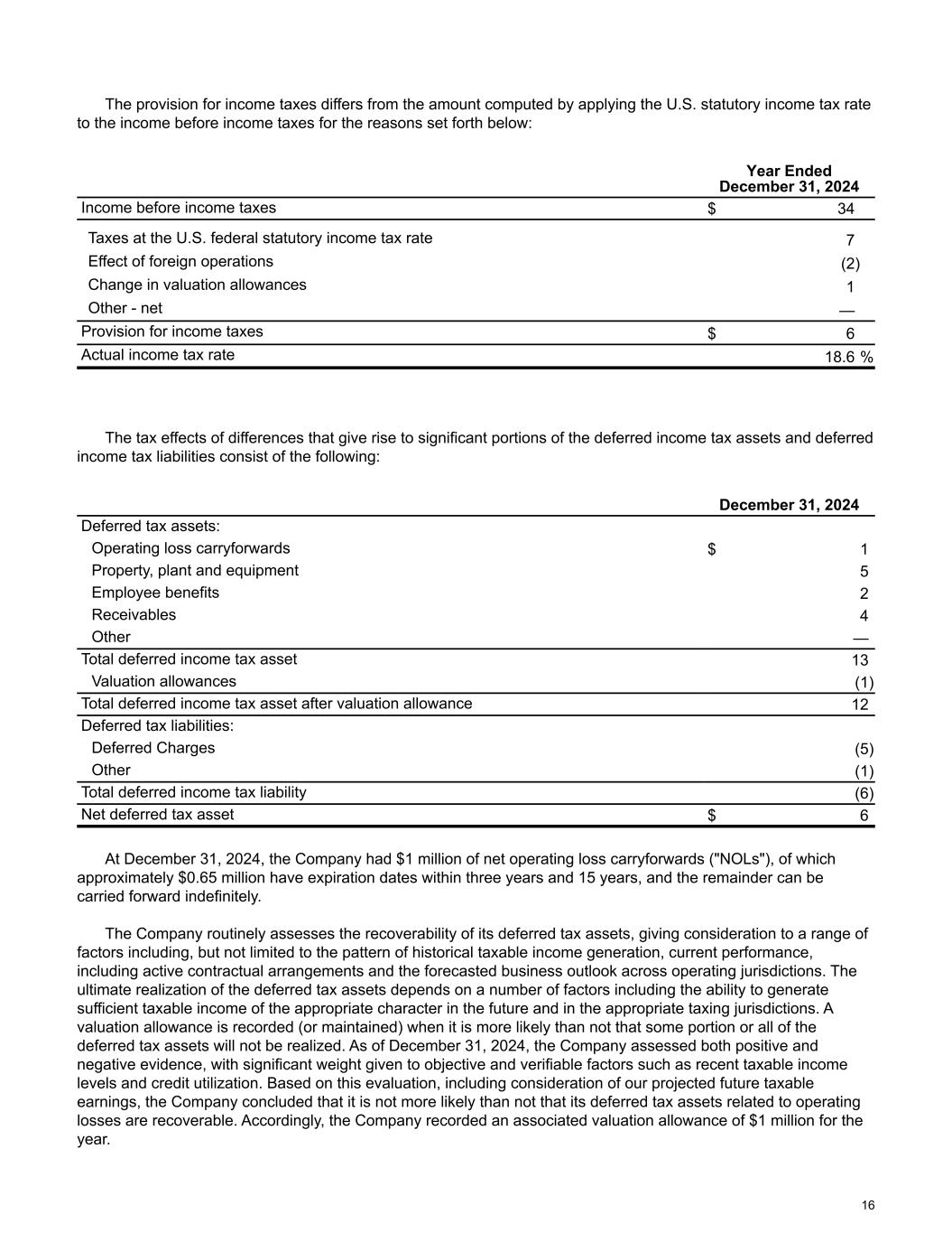 The provision for income taxes differs from the amount computed by applying the U.S. statutory income tax rate to the income before income taxes for the reasons set forth below: Year Ended December 31, 2024 Income before income taxes $ 34 Taxes at the U.S. federal statutory income tax rate 7 Effect of foreign operations (2) Change in valuation allowances 1 Other - net — Provision for income taxes $ 6 Actual income tax rate 18.6 % The tax effects of differences that give rise to significant portions of the deferred income tax assets and deferred income tax liabilities consist of the following: December 31, 2024 Deferred tax assets: Operating loss carryforwards $ 1 Property, plant and equipment 5 Employee benefits 2 Receivables 4 Other — Total deferred income tax asset 13 Valuation allowances (1) Total deferred income tax asset after valuation allowance 12 Deferred tax liabilities: Deferred Charges (5) Other (1) Total deferred income tax liability (6) Net deferred tax asset $ 6 At December 31, 2024, the Company had $1 million of net operating loss carryforwards ("NOLs"), of which approximately $0.65 million have expiration dates within three years and 15 years, and the remainder can be carried forward indefinitely. The Company routinely assesses the recoverability of its deferred tax assets, giving consideration to a range of factors including, but not limited to the pattern of historical taxable income generation, current performance, including active contractual arrangements and the forecasted business outlook across operating jurisdictions. The ultimate realization of the deferred tax assets depends on a number of factors including the ability to generate sufficient taxable income of the appropriate character in the future and in the appropriate taxing jurisdictions. A valuation allowance is recorded (or maintained) when it is more likely than not that some portion or all of the deferred tax assets will not be realized. As of December 31, 2024, the Company assessed both positive and negative evidence, with significant weight given to objective and verifiable factors such as recent taxable income levels and credit utilization. Based on this evaluation, including consideration of our projected future taxable earnings, the Company concluded that it is not more likely than not that its deferred tax assets related to operating losses are recoverable. Accordingly, the Company recorded an associated valuation allowance of $1 million for the year. 16