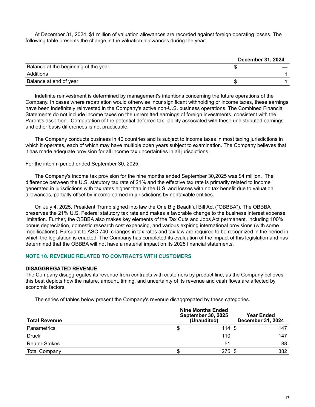 At December 31, 2024, $1 million of valuation allowances are recorded against foreign operating losses. The following table presents the change in the valuation allowances during the year: December 31, 2024 Balance at the beginning of the year $ — Additions 1 Balance at end of year $ 1 Indefinite reinvestment is determined by management's intentions concerning the future operations of the Company. In cases where repatriation would otherwise incur significant withholding or income taxes, these earnings have been indefinitely reinvested in the Company's active non-U.S. business operations. The Combined Financial Statements do not include income taxes on the unremitted earnings of foreign investments, consistent with the Parent's assertion. Computation of the potential deferred tax liability associated with these undistributed earnings and other basis differences is not practicable. The Company conducts business in 40 countries and is subject to income taxes in most taxing jurisdictions in which it operates, each of which may have multiple open years subject to examination. The Company believes that it has made adequate provision for all income tax uncertainties in all jurisdictions. For the interim period ended September 30, 2025: The Company's income tax provision for the nine months ended September 30,2025 was $4 million. The difference between the U.S. statutory tax rate of 21% and the effective tax rate is primarily related to income generated in jurisdictions with tax rates higher than in the U.S. and losses with no tax benefit due to valuation allowances, partially offset by income earned in jurisdictions by nontaxable entities. On July 4, 2025, President Trump signed into law the One Big Beautiful Bill Act ("OBBBA"). The OBBBA preserves the 21% U.S. Federal statutory tax rate and makes a favorable change to the business interest expense limitation. Further, the OBBBA also makes key elements of the Tax Cuts and Jobs Act permanent, including 100% bonus depreciation, domestic research cost expensing, and various expiring international provisions (with some modifications). Pursuant to ASC 740, changes in tax rates and tax law are required to be recognized in the period in which the legislation is enacted. The Company has completed its evaluation of the impact of this legislation and has determined that the OBBBA will not have a material impact on its 2025 financial statements. NOTE 10. REVENUE RELATED TO CONTRACTS WITH CUSTOMERS DISAGGREGATED REVENUE The Company disaggregates its revenue from contracts with customers by product line, as the Company believes this best depicts how the nature, amount, timing, and uncertainty of its revenue and cash flows are affected by economic factors. The series of tables below present the Company's revenue disaggregated by these categories. Total Revenue Nine Months Ended September 30, 2025 (Unaudited) Year Ended December 31, 2024 Panametrics $ 114 $ 147 Druck 110 147 Reuter-Stokes 51 88 Total Company $ 275 $ 382 17