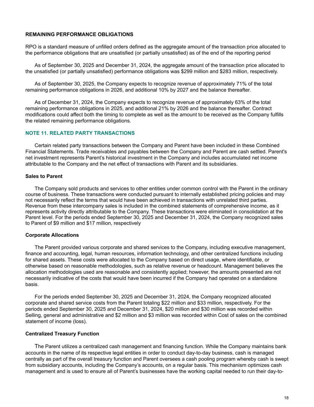 REMAINING PERFORMANCE OBLIGATIONS RPO is a standard measure of unfilled orders defined as the aggregate amount of the transaction price allocated to the performance obligations that are unsatisfied (or partially unsatisfied) as of the end of the reporting period As of September 30, 2025 and December 31, 2024, the aggregate amount of the transaction price allocated to the unsatisfied (or partially unsatisfied) performance obligations was $299 million and $283 million, respectively. As of September 30, 2025, the Company expects to recognize revenue of approximately 71% of the total remaining performance obligations in 2026, and additional 10% by 2027 and the balance thereafter. As of December 31, 2024, the Company expects to recognize revenue of approximately 63% of the total remaining performance obligations in 2025, and additional 21% by 2026 and the balance thereafter. Contract modifications could affect both the timing to complete as well as the amount to be received as the Company fulfills the related remaining performance obligations. NOTE 11. RELATED PARTY TRANSACTIONS Certain related party transactions between the Company and Parent have been included in these Combined Financial Statements. Trade receivables and payables between the Company and Parent are cash settled. Parent's net investment represents Parent’s historical investment in the Company and includes accumulated net income attributable to the Company and the net effect of transactions with Parent and its subsidiaries. Sales to Parent The Company sold products and services to other entities under common control with the Parent in the ordinary course of business. These transactions were conducted pursuant to internally established pricing policies and may not necessarily reflect the terms that would have been achieved in transactions with unrelated third parties. Revenue from these intercompany sales is included in the combined statements of comprehensive income, as it represents activity directly attributable to the Company. These transactions were eliminated in consolidation at the Parent level. For the periods ended September 30, 2025 and December 31, 2024, the Company recognized sales to Parent of $9 million and $17 million, respectively Corporate Allocations The Parent provided various corporate and shared services to the Company, including executive management, finance and accounting, legal, human resources, information technology, and other centralized functions including for shared assets. These costs were allocated to the Company based on direct usage, where identifiable, or otherwise based on reasonable methodologies, such as relative revenue or headcount. Management believes the allocation methodologies used are reasonable and consistently applied; however, the amounts presented are not necessarily indicative of the costs that would have been incurred if the Company had operated on a standalone basis. For the periods ended September 30, 2025 and December 31, 2024, the Company recognized allocated corporate and shared service costs from the Parent totaling $22 million and $33 million, respectively. For the periods ended September 30, 2025 and December 31, 2024, $20 million and $30 million was recorded within Selling, general and administrative and $2 million and $3 million was recorded within Cost of sales on the combined statement of income (loss). Centralized Treasury Function The Parent utilizes a centralized cash management and financing function. While the Company maintains bank accounts in the name of its respective legal entities in order to conduct day-to-day business, cash is managed centrally as part of the overall treasury function and Parent oversees a cash pooling program whereby cash is swept from subsidiary accounts, including the Company’s accounts, on a regular basis. This mechanism optimizes cash management and is used to ensure all of Parent’s businesses have the working capital needed to run their day-to- 18