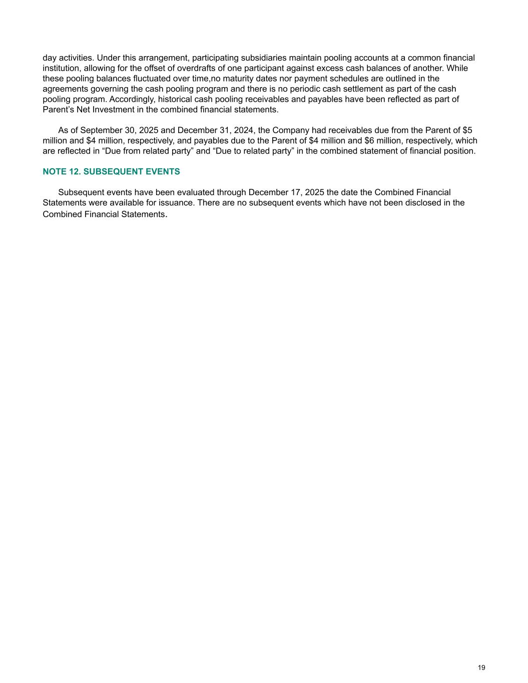 day activities. Under this arrangement, participating subsidiaries maintain pooling accounts at a common financial institution, allowing for the offset of overdrafts of one participant against excess cash balances of another. While these pooling balances fluctuated over time,no maturity dates nor payment schedules are outlined in the agreements governing the cash pooling program and there is no periodic cash settlement as part of the cash pooling program. Accordingly, historical cash pooling receivables and payables have been reflected as part of Parent’s Net Investment in the combined financial statements. As of September 30, 2025 and December 31, 2024, the Company had receivables due from the Parent of $5 million and $4 million, respectively, and payables due to the Parent of $4 million and $6 million, respectively, which are reflected in “Due from related party” and “Due to related party” in the combined statement of financial position. NOTE 12. SUBSEQUENT EVENTS Subsequent events have been evaluated through December 17, 2025 the date the Combined Financial Statements were available for issuance. There are no subsequent events which have not been disclosed in the Combined Financial Statements. 19