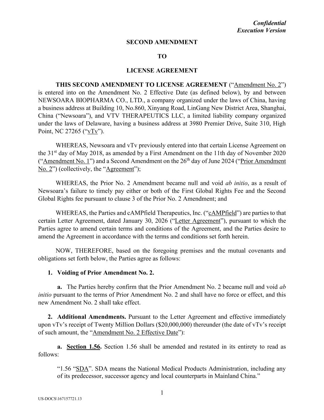 Confidential Execution Version 1 US-DOCS\167157721.13 SECOND AMENDMENT TO LICENSE AGREEMENT THIS SECOND AMENDMENT TO LICENSE AGREEMENT (“Amendment No. 2”) is entered into on the Amendment No. 2 Effective Date (as defined below), by and between NEWSOARA BIOPHARMA CO., LTD., a company organized under the laws of China, having a business address at Building 10, No.860, Xinyang Road, LinGang New District Area, Shanghai, China (“Newsoara”), and VTV THERAPEUTICS LLC, a limited liability company organized under the laws of Delaware, having a business address at 3980 Premier Drive, Suite 310, High Point, NC 27265 (“vTv”). WHEREAS, Newsoara and vTv previously entered into that certain License Agreement on the 31st day of May 2018, as amended by a First Amendment on the 11th day of November 2020 (“Amendment No. 1”) and a Second Amendment on the 26th day of June 2024 (“Prior Amendment No. 2”) (collectively, the “Agreement”); WHEREAS, the Prior No. 2 Amendment became null and void ab initio, as a result of Newsoara’s failure to timely pay either or both of the First Global Rights Fee and the Second Global Rights fee pursuant to clause 3 of the Prior No. 2 Amendment; and WHEREAS, the Parties and cAMPfield Therapeutics, Inc. (“cAMPfield”) are parties to that certain Letter Agreement, dated January 30, 2026 (“Letter Agreement”), pursuant to which the Parties agree to amend certain terms and conditions of the Agreement, and the Parties desire to amend the Agreement in accordance with the terms and conditions set forth herein. NOW, THEREFORE, based on the foregoing premises and the mutual covenants and obligations set forth below, the Parties agree as follows: 1. Voiding of Prior Amendment No. 2. a. The Parties hereby confirm that the Prior Amendment No. 2 became null and void ab initio pursuant to the terms of Prior Amendment No. 2 and shall have no force or effect, and this new Amendment No. 2 shall take effect. 2. Additional Amendments. Pursuant to the Letter Agreement and effective immediately upon vTv’s receipt of Twenty Million Dollars ($20,000,000) thereunder (the date of vTv’s receipt of such amount, the “Amendment No. 2 Effective Date”): a. Section 1.56. Section 1.56 shall be amended and restated in its entirety to read as follows: “1.56 “SDA”. SDA means the National Medical Products Administration, including any of its predecessor, successor agency and local counterparts in Mainland China.”